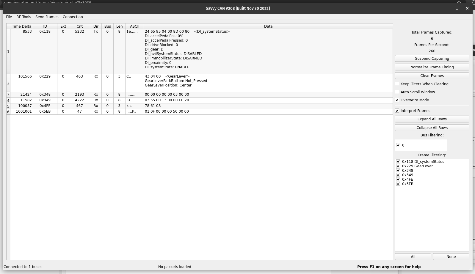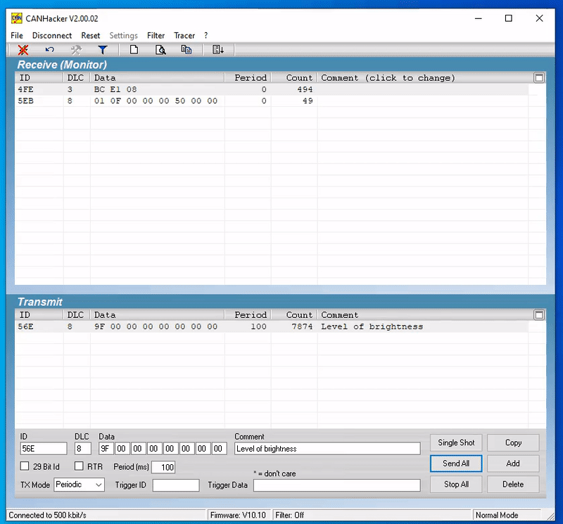 - The message 4FE looks encouraging because it only has one constantly changing byte (maybe counter or checksum, although it looks to change semi-randomly which makes me think checksum).
