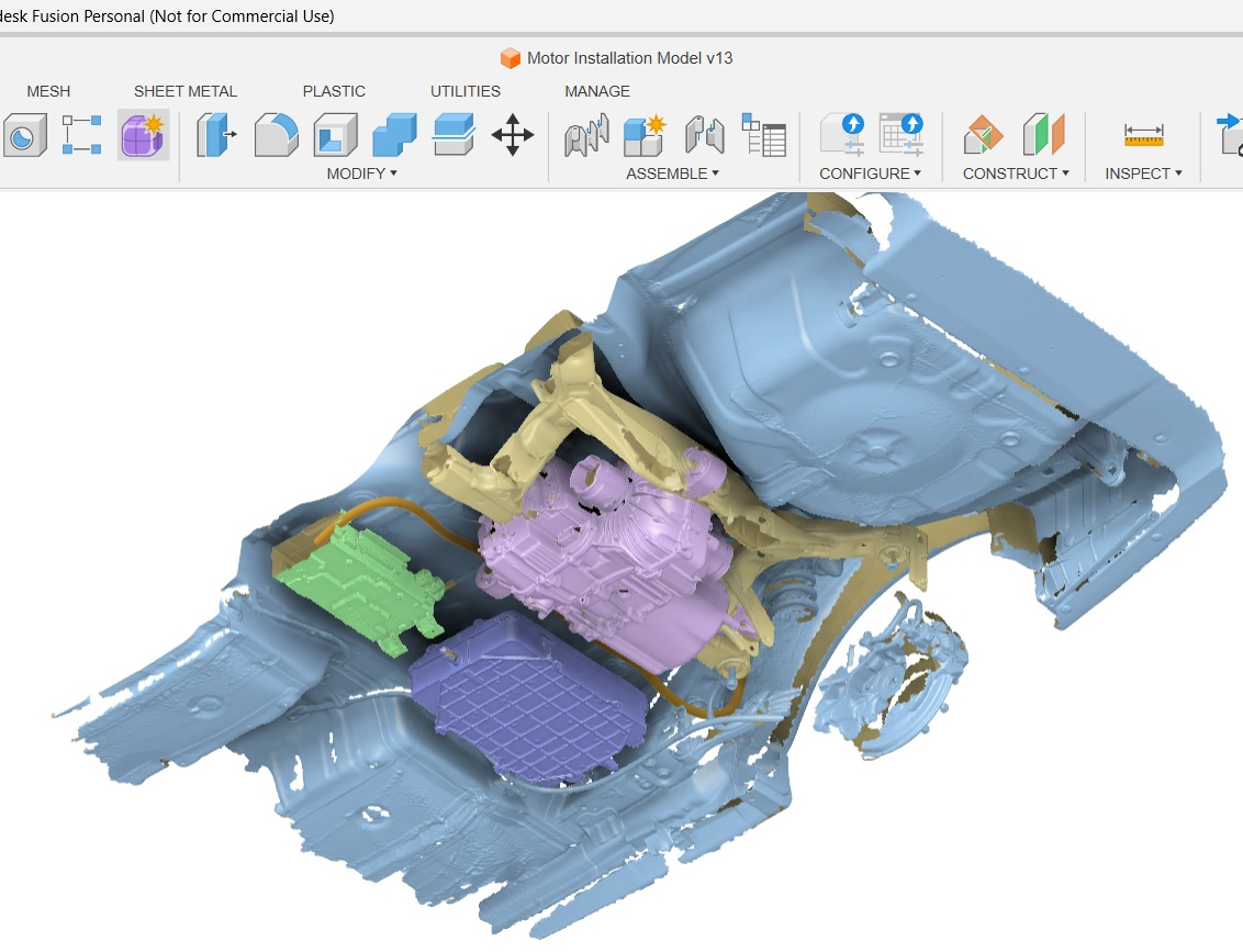 This shows the motor, and the onboard GEN 2 Tesla charger and rear junction box which fit in the space of where the fuel tank used to be: Am I a grandmaster at 3D scanning - NO! Am I super good at Fusion 360 - NO! Am I learning all sorts of new stuff - YES!