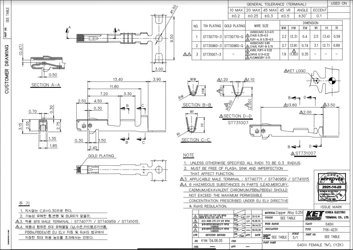 KET drawing (Use the pin P/N appropriate for your BMS wire. In the case of my Dilithium BMS 22awg wire that would be ST730770): TE drawing (again assuming 22awg wire): The old pins can be removed from the housing by carefully prying the back portion of the connector up, which snaps into placed to hold the pins in.