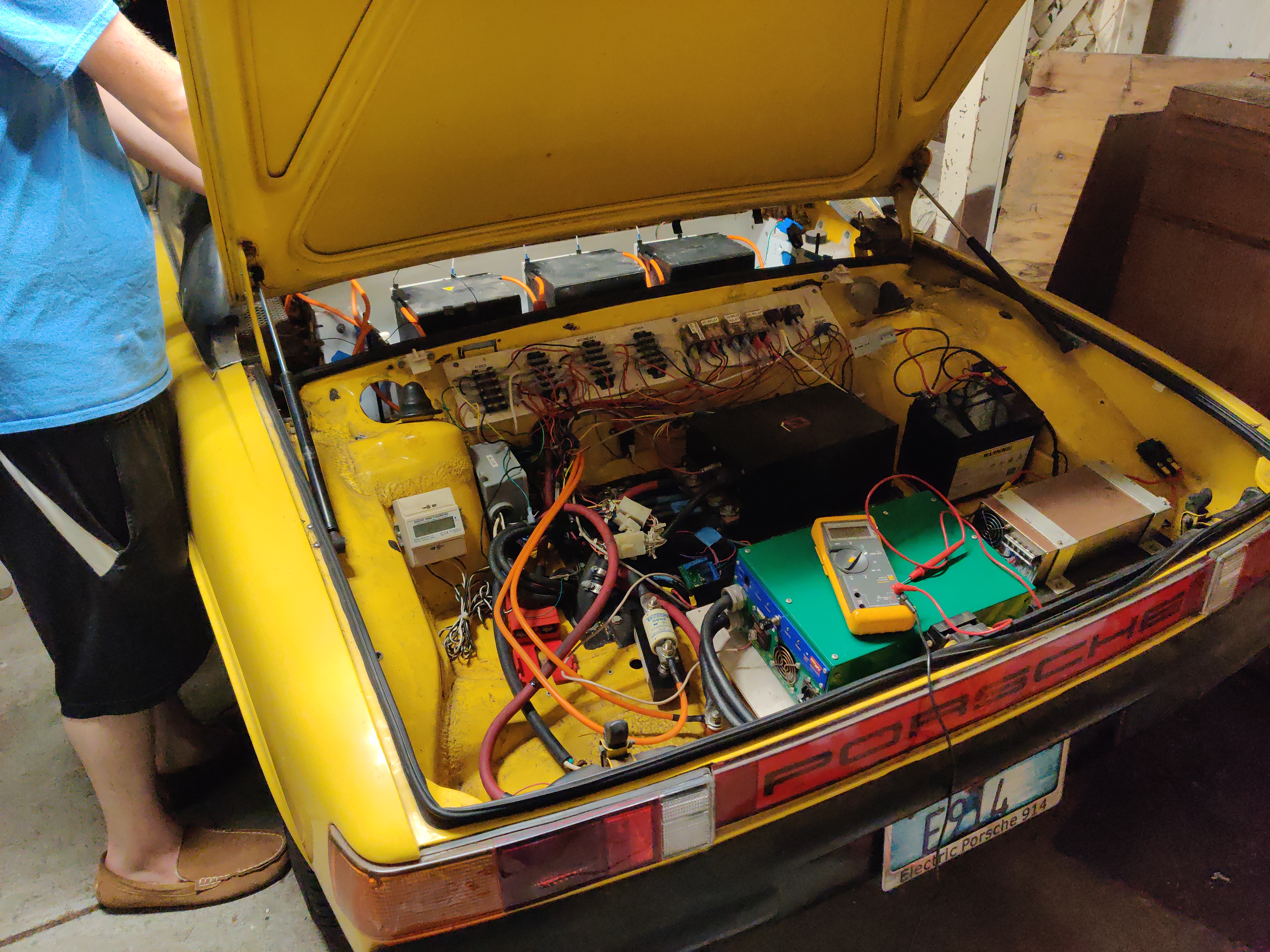 Just in the past week or so I finished integrating the Leaf inverter into the car. I ended up trimming one of the DC input busbars so I could have the cables exit sideways, and 3d printed shrouds for the DC input and phase output. Some initial guesses about motor control constants later and I had the motor spinning, and once I had corrected my reversed resolver constant (resulting in flux strengthening instead of flux weakening - thanks Pete), I was off and running. I drove the car around a bit honing in on some initial guesses of flux level and lqminusld which seem to be performing pretty well, still more tuning to do but I'm fairly close to where I was with the Greatland Electric inverter, except with much better regen, the higher redline I had always wanted of 5600 (matching the 914's original redline). It still feels a bit power limited, but I figure with some better tuning, perhaps running the log based parameter estimator I'll be able to get some better performance. Still very happy with how the openinverter Leaf inverter worked out - I figure any off the shelf inverter would've been more expensive and tougher to set up with a motor that came with no parameters. And now I finally have a functional tachometer.