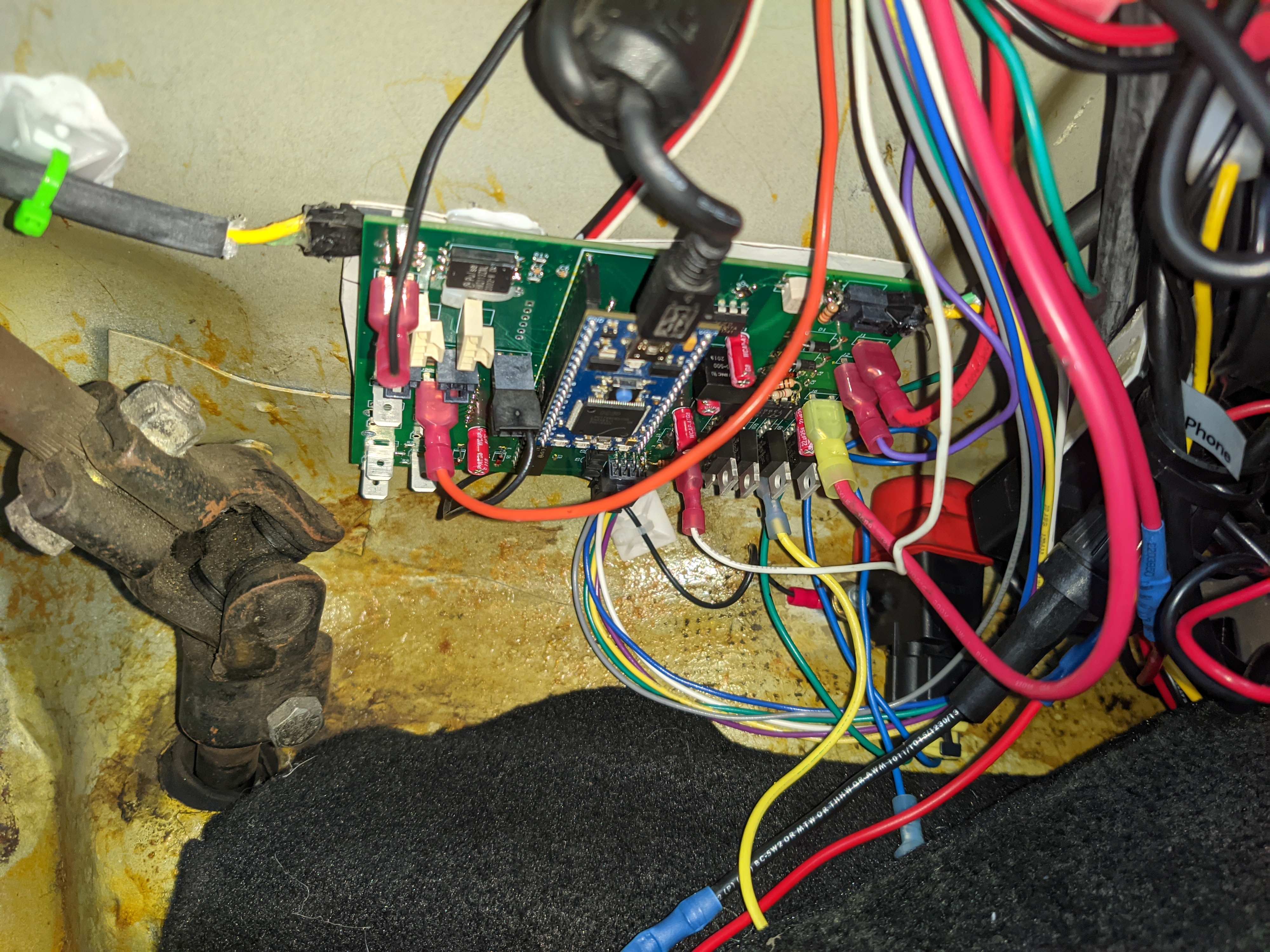 First step was to get the battery pack going. The batteries I had were 28s 29ah Farasis modules - the same as used in Zero Motorcycles. But, I had no BMS for them. The year after I graduated the FSAE team had built up their own BMS using LTC6811 chips over IsoSPI, and wrote the software. So I made my own BMS using the related LTC6813 chips, and used the Formula Slug software library to communicate with them. I was able to use this to spin up the motor and drive the car around a bit, around late February 2021. You can see the exposed main pack fuse here - there are some less obvious things that needed fixing as well. I was able to put the batteries in the original Electro Automotive battery box that the old iron phosphate cells were in before, which was quite handy. Next up, charging. The car came with a Manzanita Micro charger - many of the old EV conversions I've seen have them, it's the green box in the above photo. It didn't seem to work when I tried it, so I contacted the original manufacturer. Turns out, it will overvolt and fry itself if you power it on without a battery connected. So, I mailed mine in to be fixed, got it back, hooked it up to charge for a bit, it seemed to work but the current output was a bit spiky. I then opened my battery contactors, plugged it in again, and fried it again. So, I decided it was time for a better and more modern charger, preferably with built in J1772 negotiation. This is when I really first discovered openinverter and the Tesla Gen2 charger - got my hands on one from Ebay and a kit from the shop, was able to get it set up and running and start J1772 charging pretty easily. The main things that tripped me up were needing to desolder the connector from the Tesla board (this was peak supply chain shortages) and needing to set up the CAN termination.