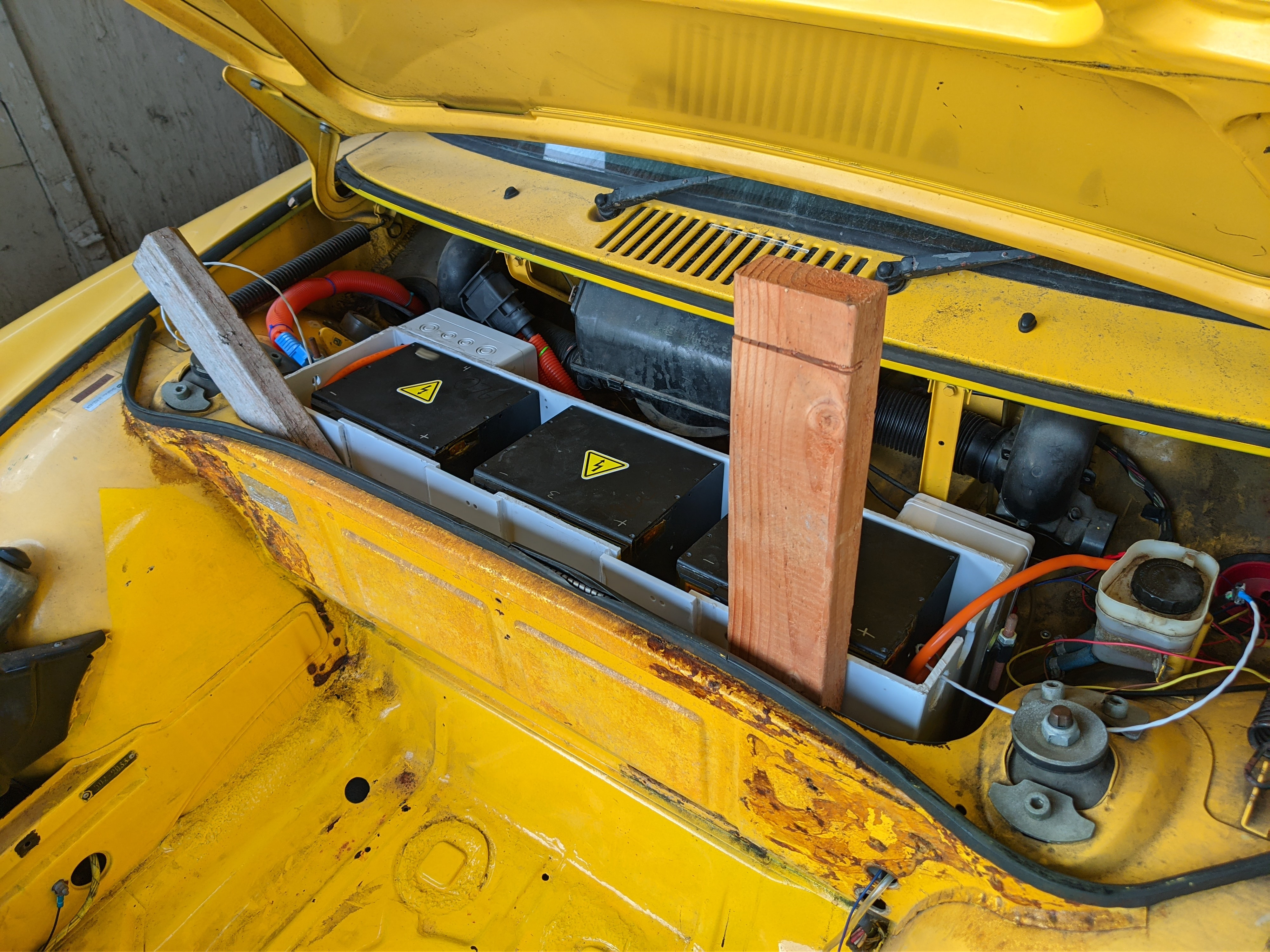 Next up was a sort of combo VCU/contactor control board. I had been running on a breadboard hanging out by my feet talking over IsoSPI and driving a little display in the dash, so I built that as well as contactor control, some 12V GPIOs for various outputs for the lights on the dash, etc into a PCB and installed that into the car. I was able to write up an SoC estimator and use that to drive the fuel gauge in the dash, as well as light up some of the LEDs for various faults (including the low 'fuel'/reserve light set for 15% SoC or below). I also set up a CAN interface on here for once I replaced the inverter so I could use data from it to drive the tachometer or send commands/limits to it from the BMS software. Next up was better batteries. I was able to get ahold of some fresher 32ah modules of the same form factor - the 29ahs were well used. I was able to swap these in for the original 3 pretty easily. I then set about building a second set to go in the front, they fit pretty much perfectly in the Electro Automotive battery box that took the space that the fuel tank used to occupy. I have no plans to fill the frunk with batteries - it's great to have that space. This allowed me to finally really put the pedal down and try to reach that real 80kW target. This is when I found that sometimes, you end up doing a 'clutch burnout'...you can hear the RPMs surge in this video when it happens. Generally it didn't happen though. With the 4000RPM limit and the gearing, 2nd gear only got you to 30mph (quite quickly though) so 3rd -> 4th was usually how I would pull onto the highway.