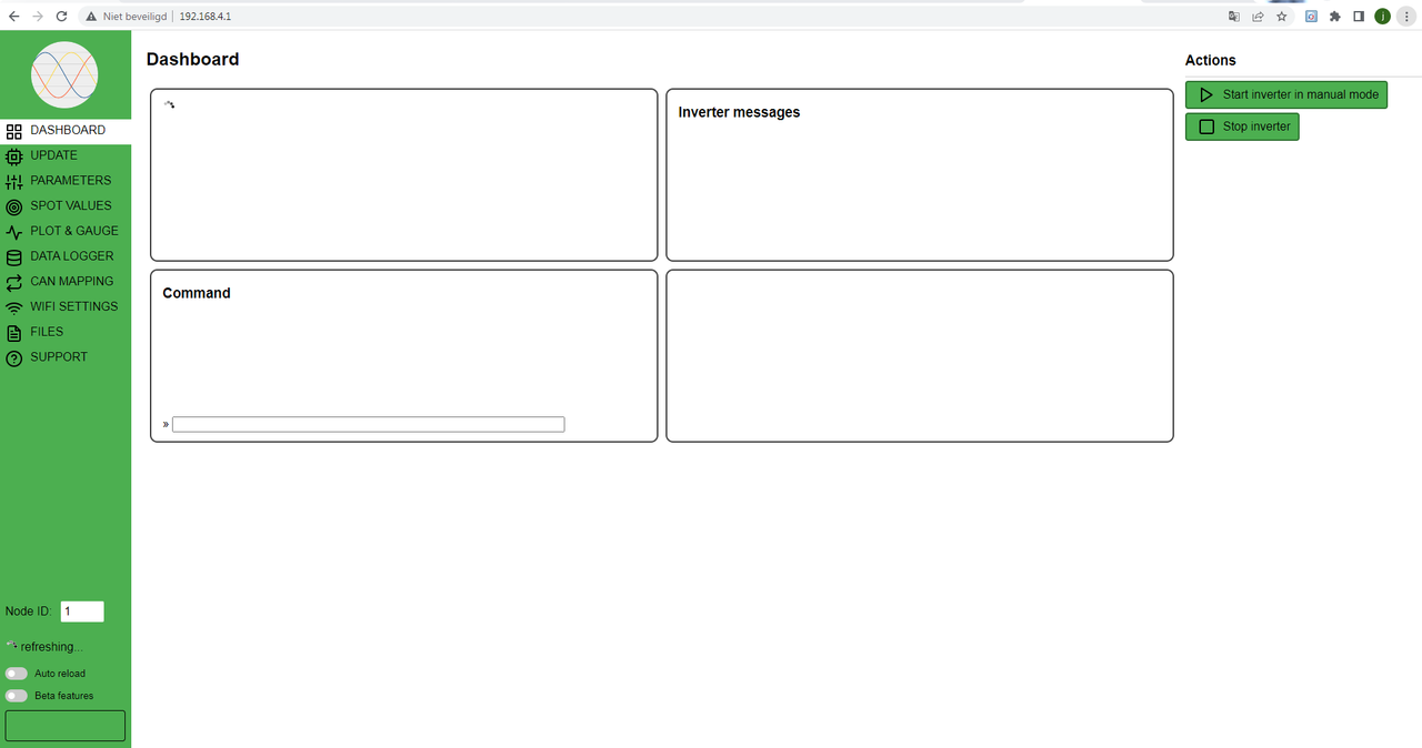 i am ev converting a g-wagon with a tesla sdu setup. this setup has a openinverter board and is running good. i am now trying to add the esp32 canlite module to this setup due to the inverter wifi signal not reachin the cabin. i am having trouble with this as i get no paramaters or spotvalues in the esp32 interface. i added a picture of this interface. simultaniously also the interface of the inverter has changed. i added a picture of this changed interface too. at this point a can no longer see any spot values or change any parameters. at one point when connected to the inverter the same interface as the esp32 showed up and all the paramaters and spot values where visible but this was a one time event.