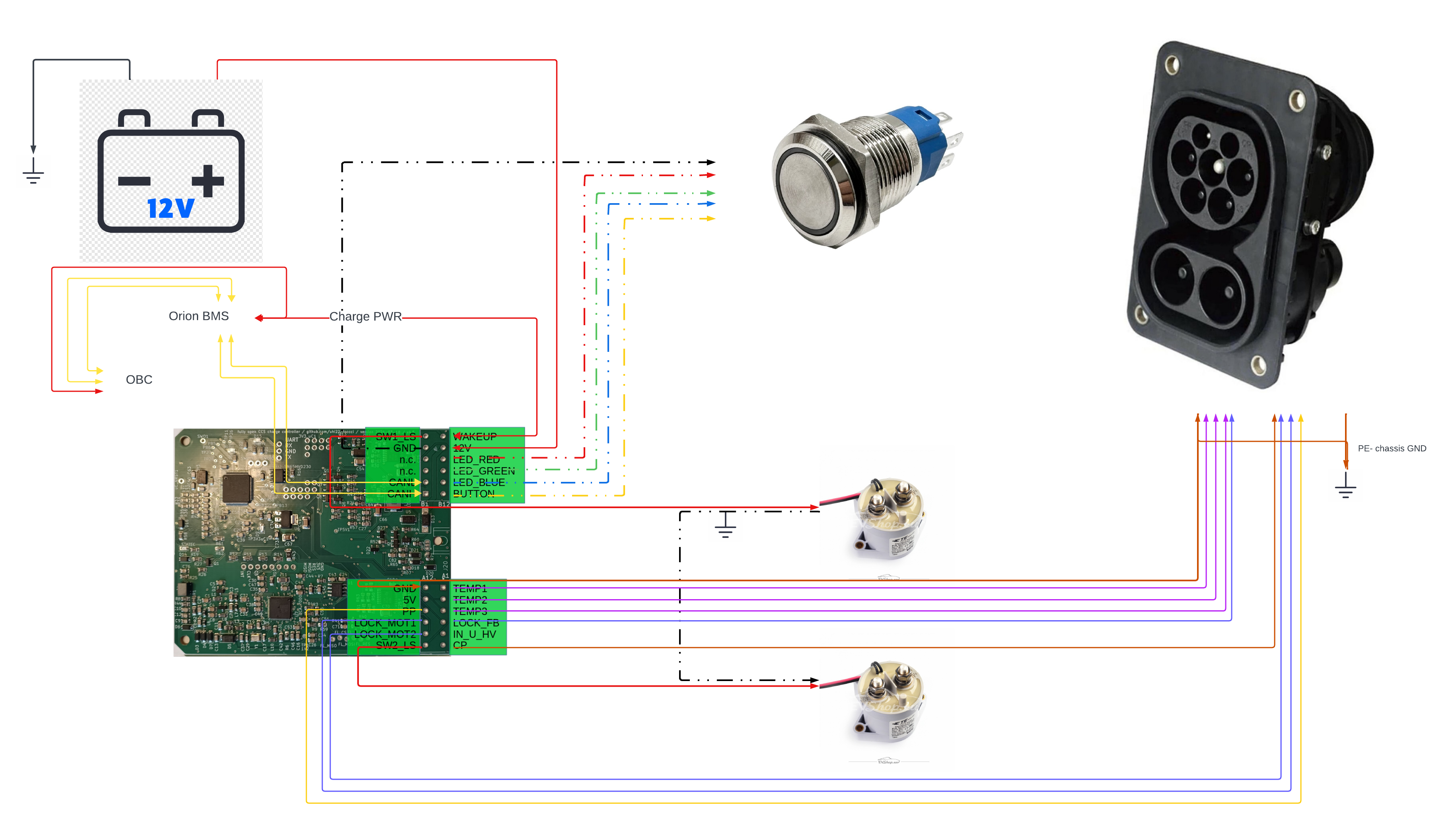 - wire the PE of the charge port to a good chassis ground (this is a path which shall be able to carry some hundred amps in case of a AC-to-chassis shortcut)