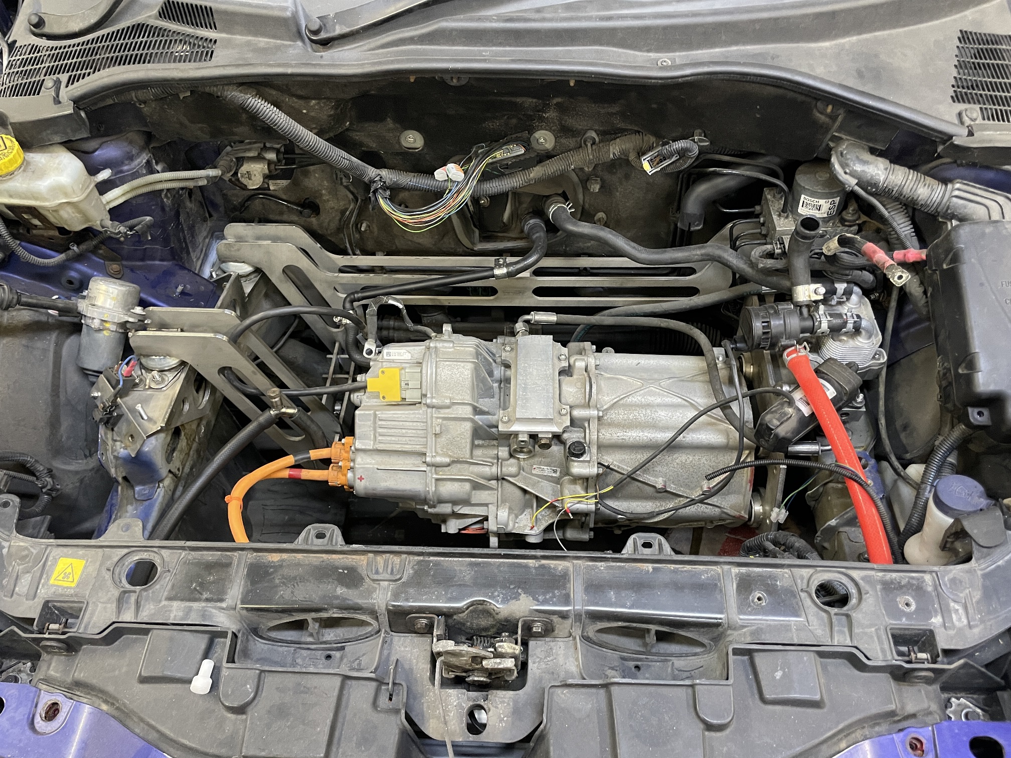 Rear mounted bespoke stainless battery box contains 5s2p Volvo XC90 type modules giving 330v @ 60Ahr. Modules sell for £150-200 ea !