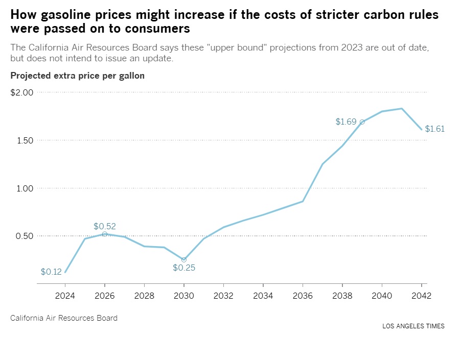 California Air Resources Board staffers estimated last year that the new rules could raise the price of a gallon of gas by as much as 47 cents next year. By 2040, the added cost to the price per gallon could be $1.80, staff members estimated in their 2023 document.