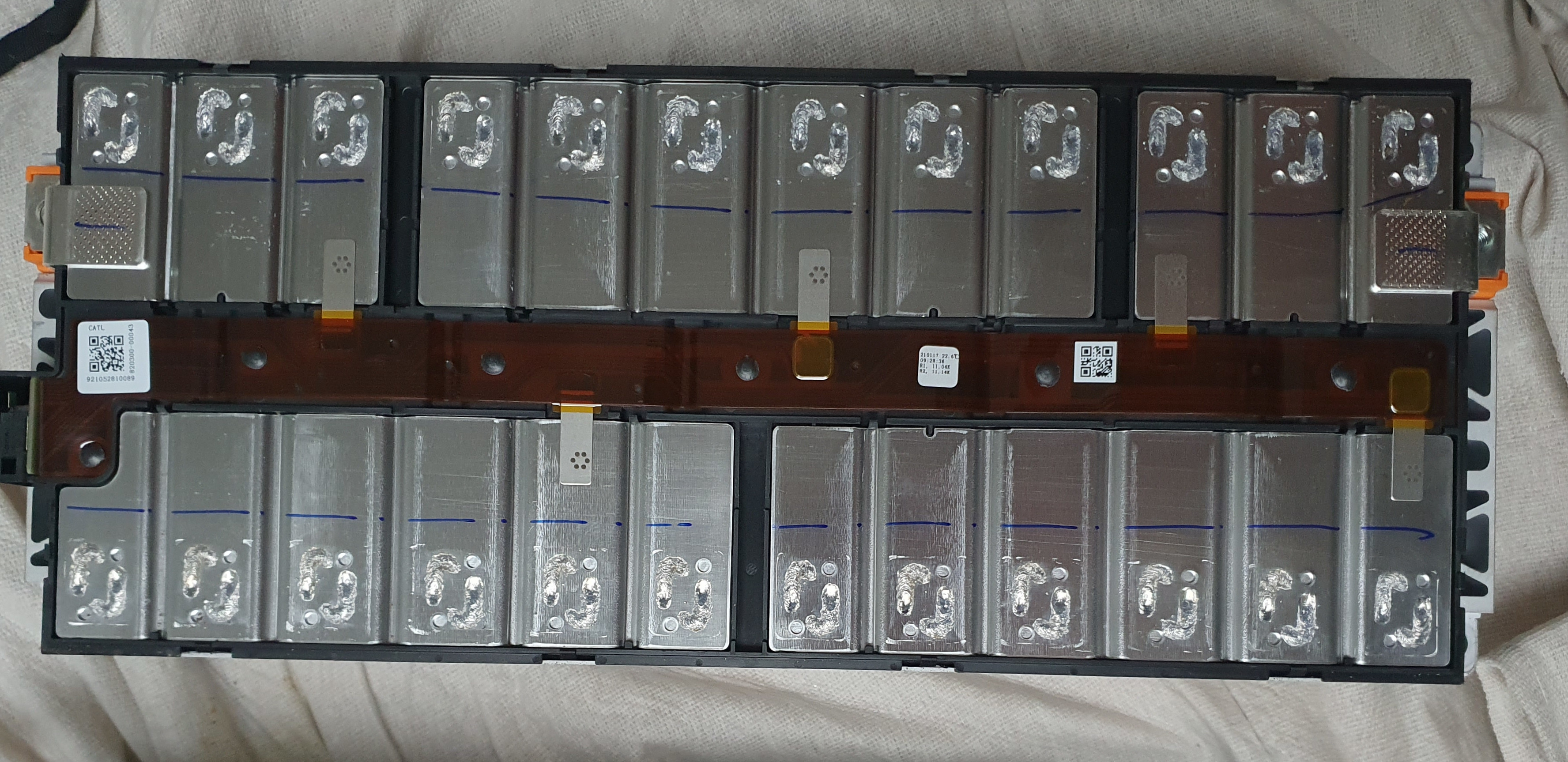 I've taken apart a 75kWh battery. It is made of 27 modules with a 4S3P configuration for 108S. The cells are from CATL. I've attached some pictures.