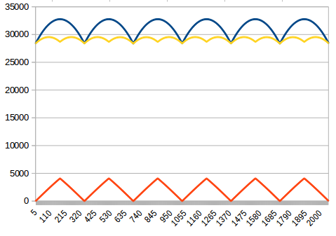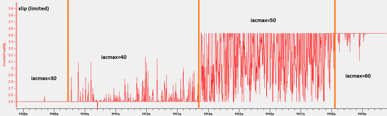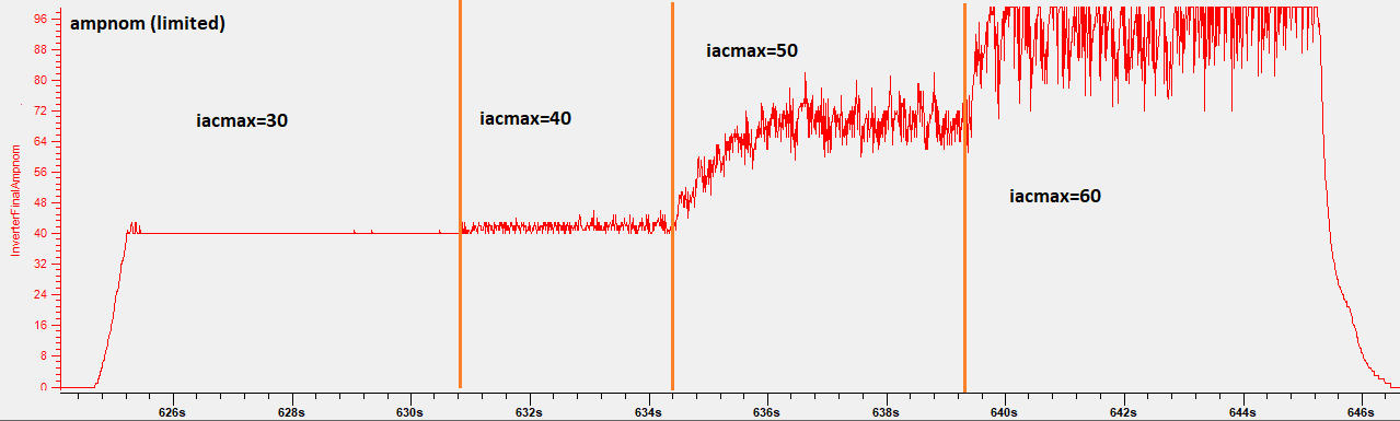 I was looking at the way we are limiting the current here (LimitCurrent method). As far as I understand, the LimitCurrent method is called at every PWM interrupt and uses the raw current values, not the RMS values. The software reads il1 and il2, calculates il3=-il1-il2, then finds IlMax = MAX(ABS(il1), ABS(il2), ABS(il3)). Then it starts limiting the current when the IlMax reaches 95% of iacmax (the code comment says 80%, maybe a mistake?). However, due to the nature of the sine wave, IlMax results in an "umbrella" shape, so are the Fslip limit and Ampnom limits.