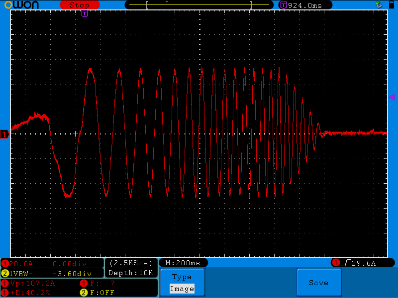So throtcur at 0.5 at 100% throttle 50A produces 107 peak to peak(probably, the current clamp is a cheap one. Hantek CC-650)