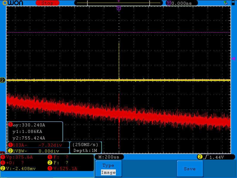 Red: current sensor signal Yellow: is ch3 PWM (for timing)