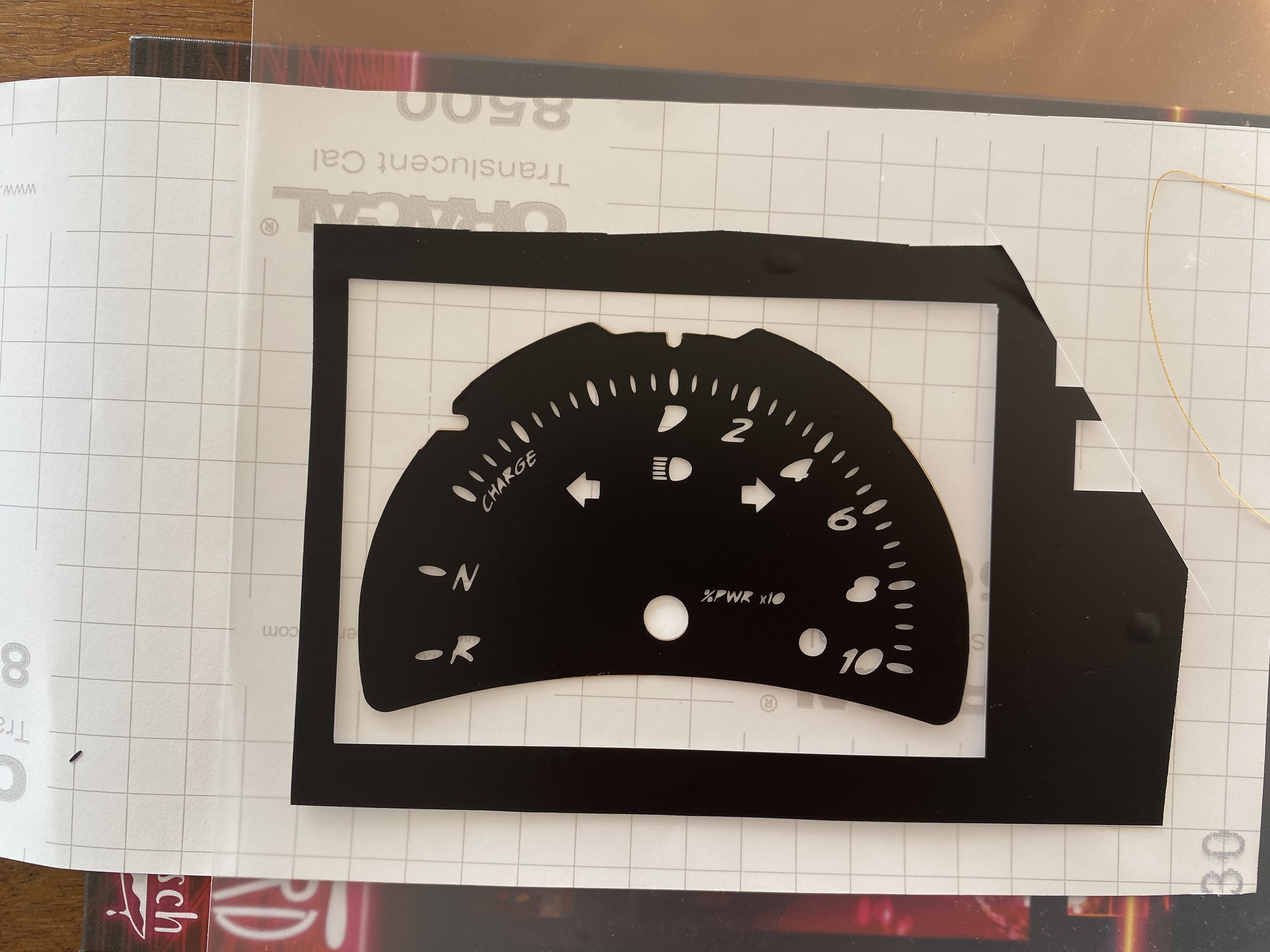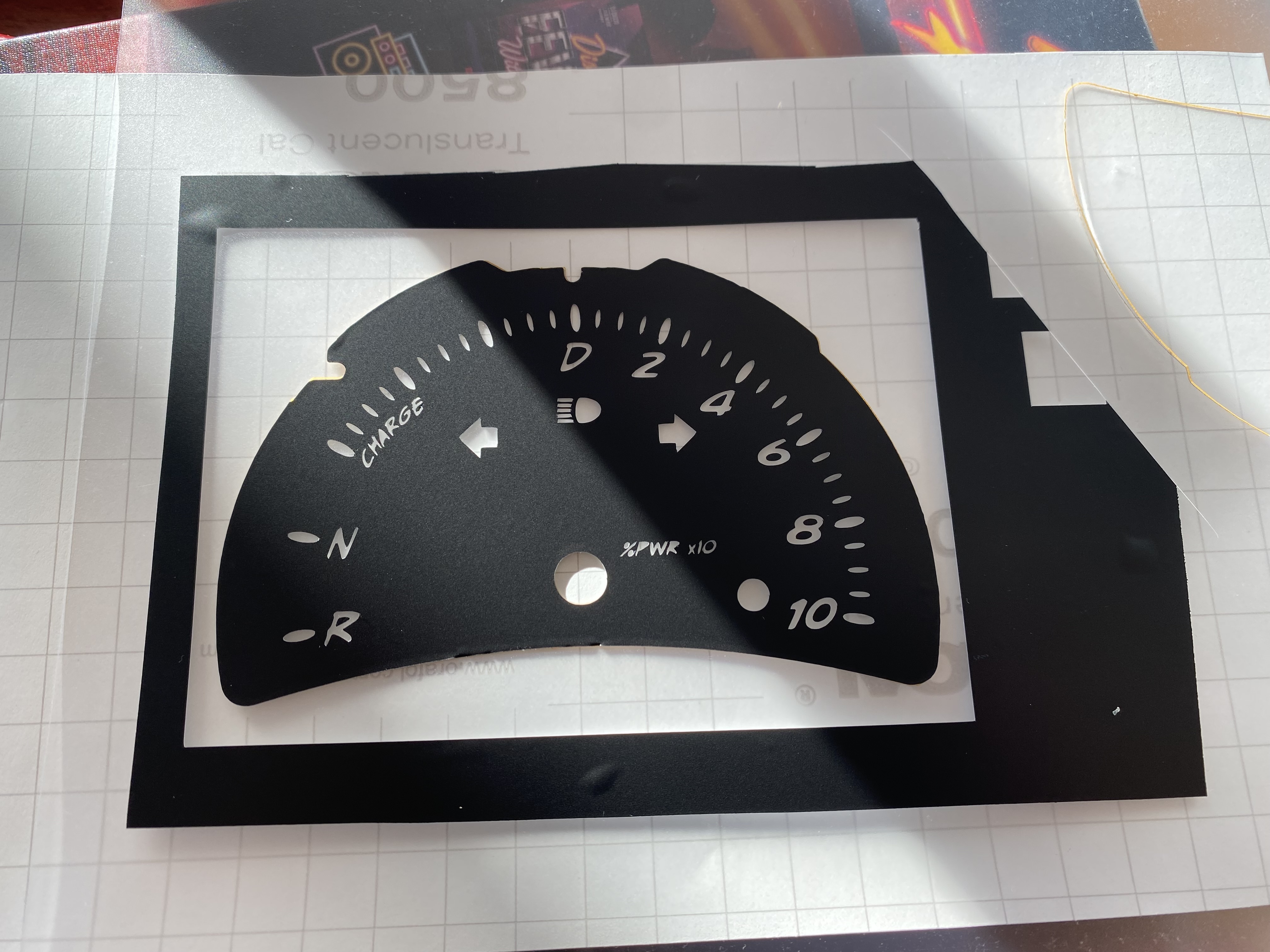 First I scanned the original cluster disc for the RPM. Then I had a friend design me in Photoshop a modified one. I cut a 0.3 mm frosted acrylic glas on a laser cutter to the exact dimensions. Then on a vinyl cutter I cut out two layers of vinyl. Upper layer on one side of the acrylic glas is Blockout Vinyl for light advertisement in black. This was basically two steps - the normal cut out and then the missing little pieces for the middle of the „0“ and „D“. On the other side of the acrylic glas translucent vinyl in green, blue and white. The translucent black one wasn’t really translucent at all. So I took overhead projector plastic and printed different test patterns in different tones of gray to fill the symbols for signal lights and high rpm. At the end I put several layers of matt clear paint on the front to fix especially the very small parts for hotter temperatures.