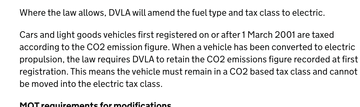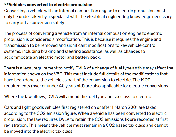 As expected, swing and a miss for the DVLA. The only mention of EV conversion is "You also need to tell DVLA if you modify a vehicle by converting it to run on electricity, even if you do not make structural modifications like changing the appearance."
