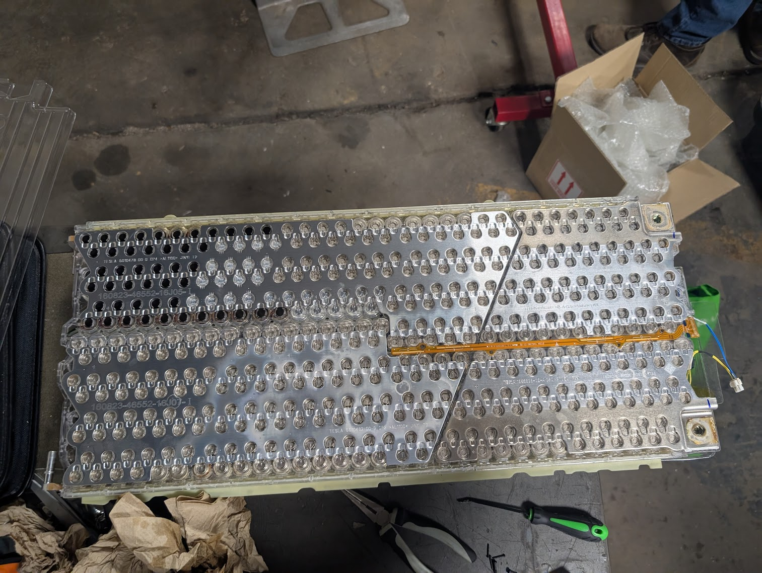 When I was doing this, 13 of the modules gave out readings between the 3.1 -3.2 range, but one of the modules gave off strange readings (only 5 cells showed up) and on closer inspection, 46 individual batteries were missing from the module.