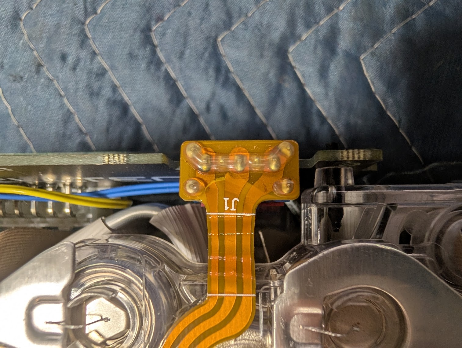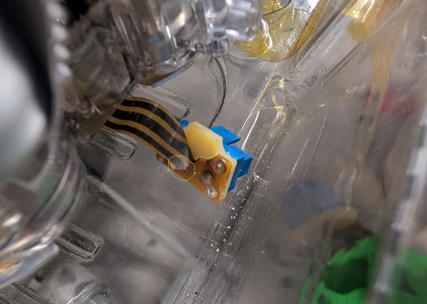 I can clearly see damage. The dark parts are the conductor tracks. One of the three is completely torn. It can't work like this, and my suspicion has been confirmed. You don't need to take any further measurements.