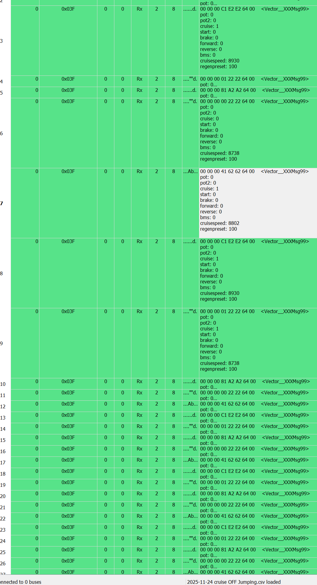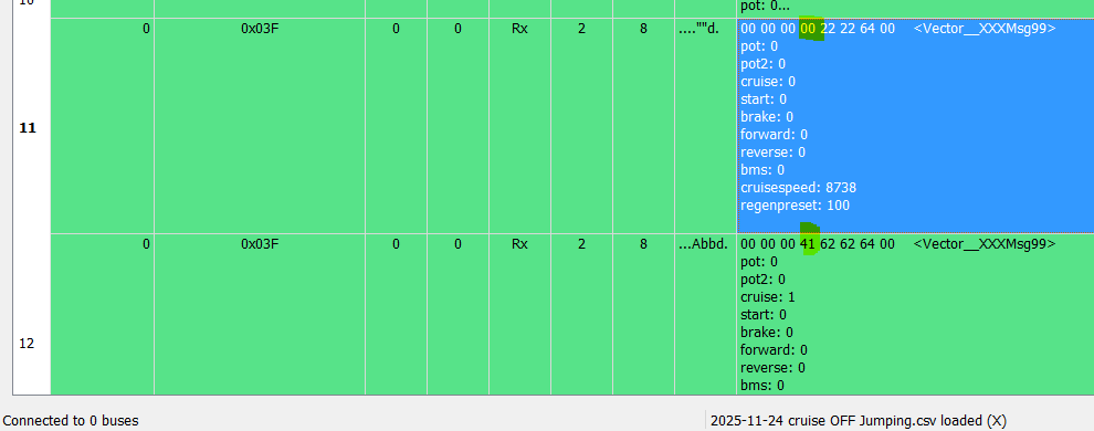 Your "cruise off" log shows byte 3 jumping from 0x00 to some value.