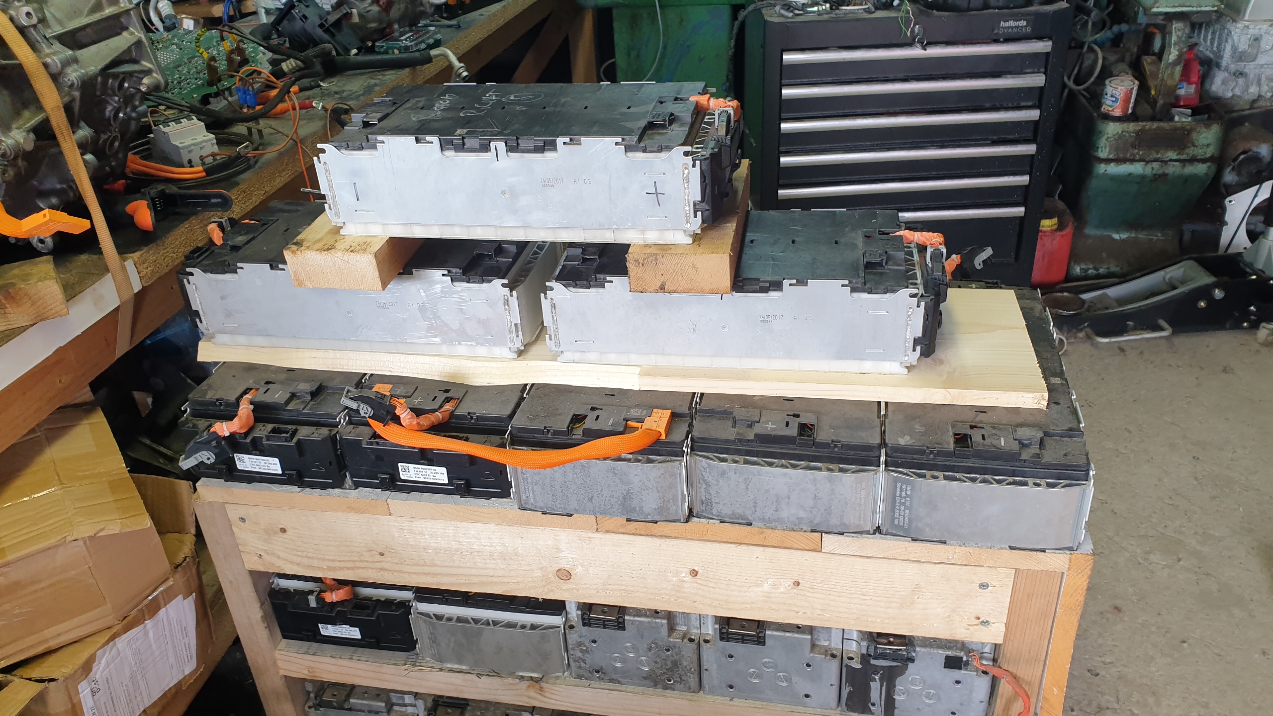 -7 x BMW Gen1 PHEV batter modules for nominally 420v and 10.5kwh in fuel tank and tunnel space.