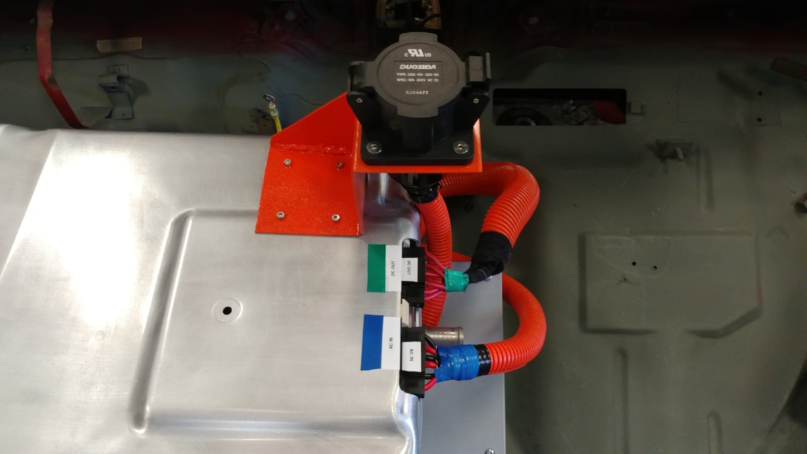 Charger access is through the middle of the hood. The lid shown in the last photo is a 6 inch deck access port that's used in the boating industry. The lid screws in with 2 turns and can be easily reached from either side of the car. I'll be making a 3d printed replacement with vw logo.