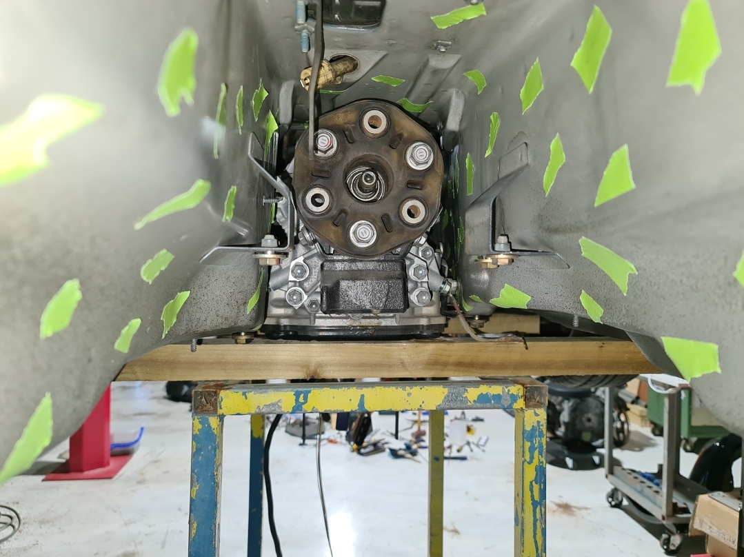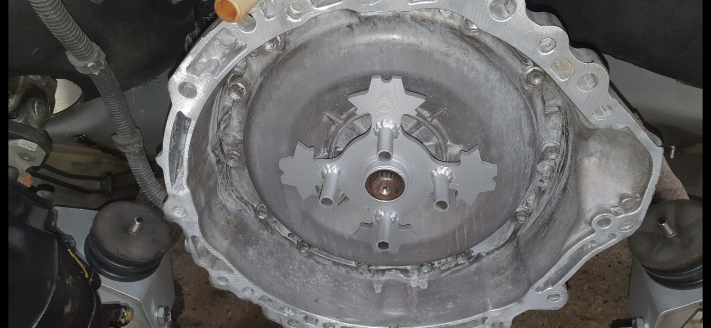 The gearbox fits like a glove and the car is now with a fabricator to create new mounting points, gearbox face incorporating the spline to lock the two motors, bracing underneath, and interface the prop shaft between the Lexus and Merc differential. I know my limitations...
