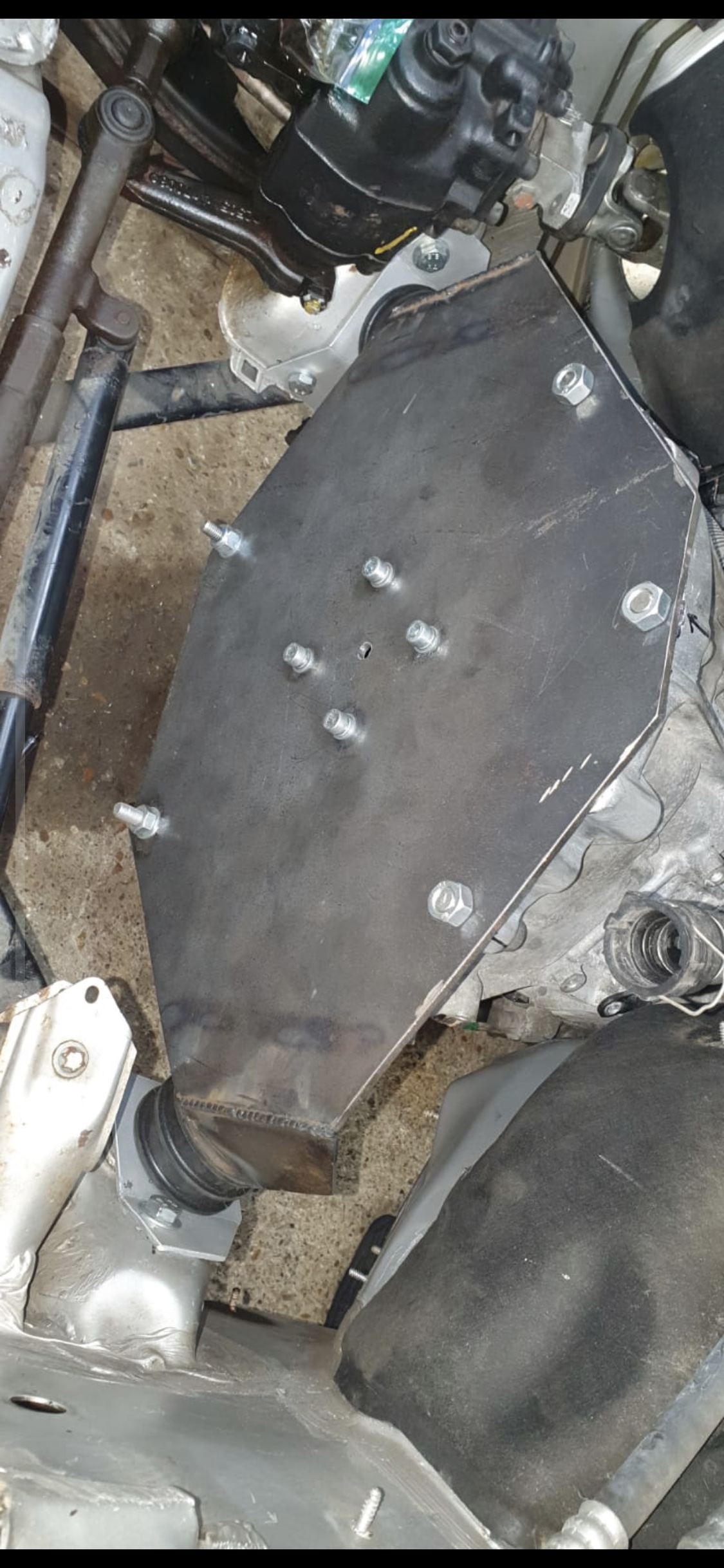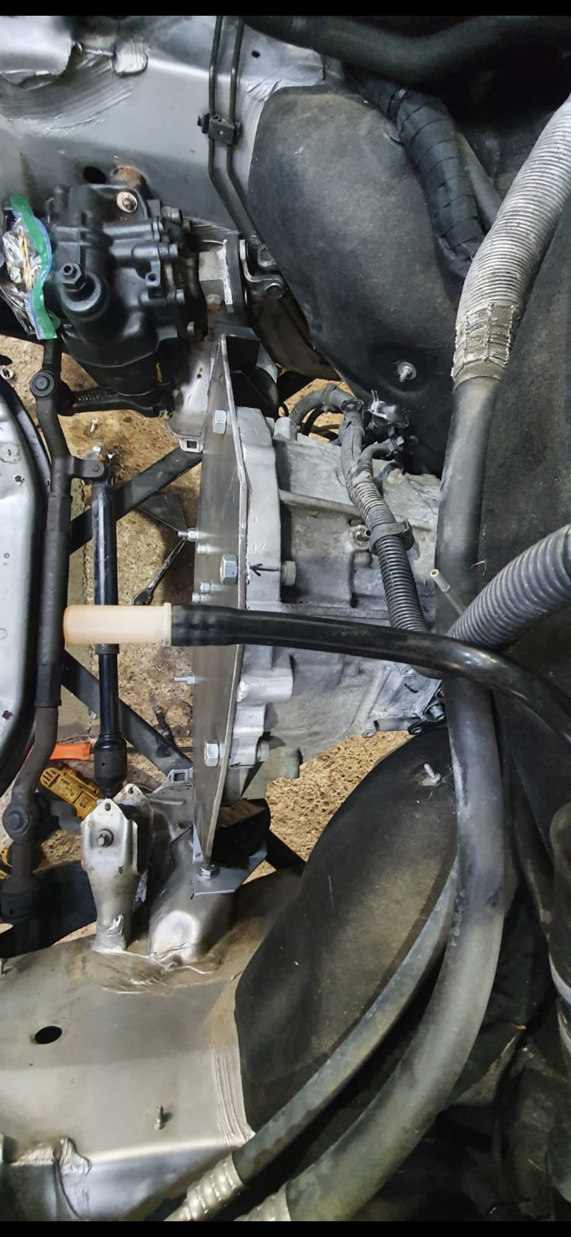 Car has returned from fabricators and I'm well impressed. Shout out to Zack @Anarchy_Kustomz for the professional looking work!! The gearbox isn't going anywhere.. Dropping the gearbox easily was one of the main requirement. Zach and I are working on costings if anyone wants a face plate (flat, no mounting wings) for the GS450H gearbox with holes drilled for bell housing and spindle, spacers for spindle, motor mounts and hardened nuts and bolts. I'll post that part under the classified section as well. Next is determining where everything can fit and work out battery box locations. Getting there...