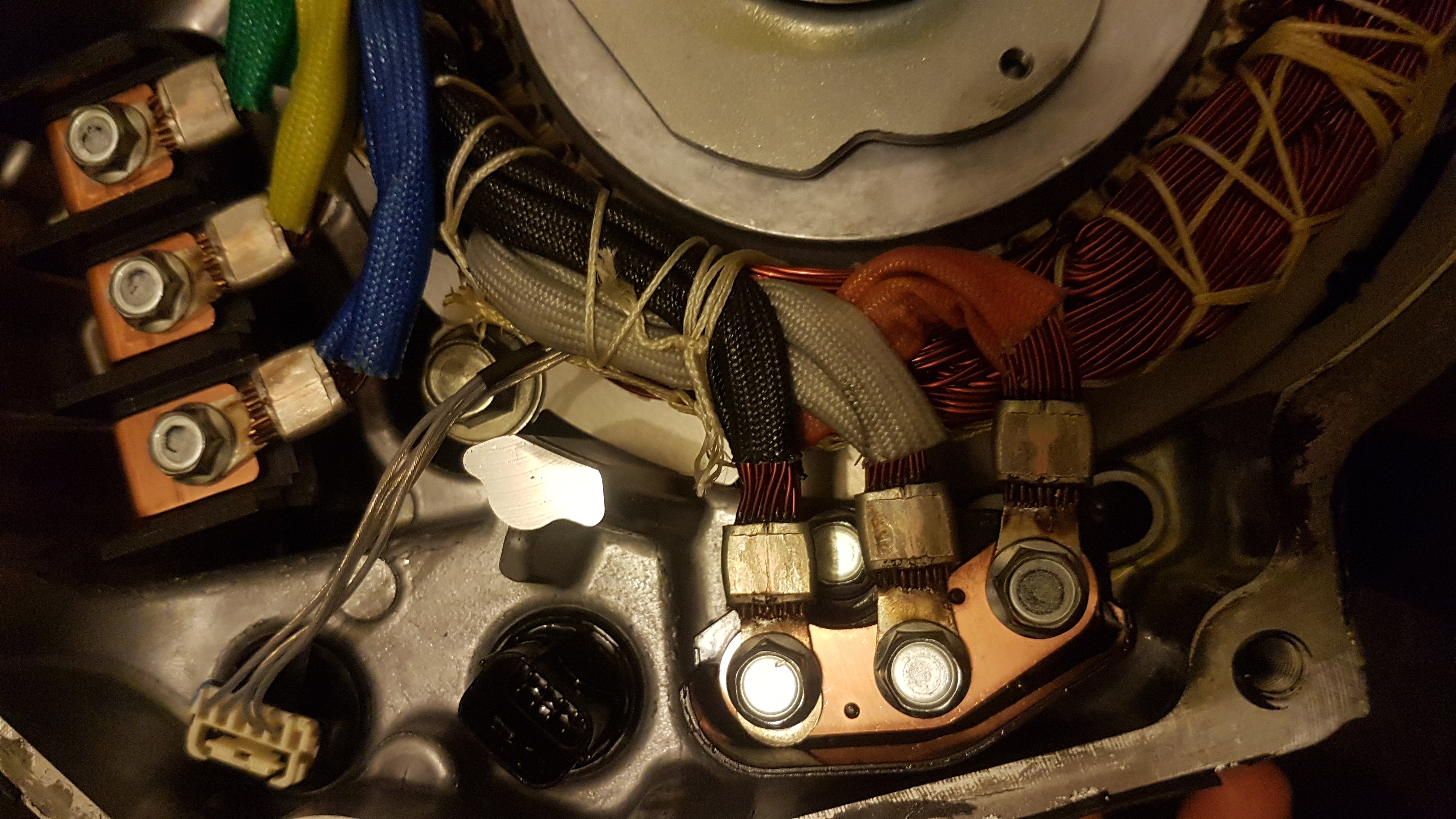 Just had been tearing down the front motor of the pair attached to the gearbox from an outlander, main aim was to see if I could retrieve one of the thermistors. Plan B might be to lay the stator in a bath of oil and heat it and take readings instead.