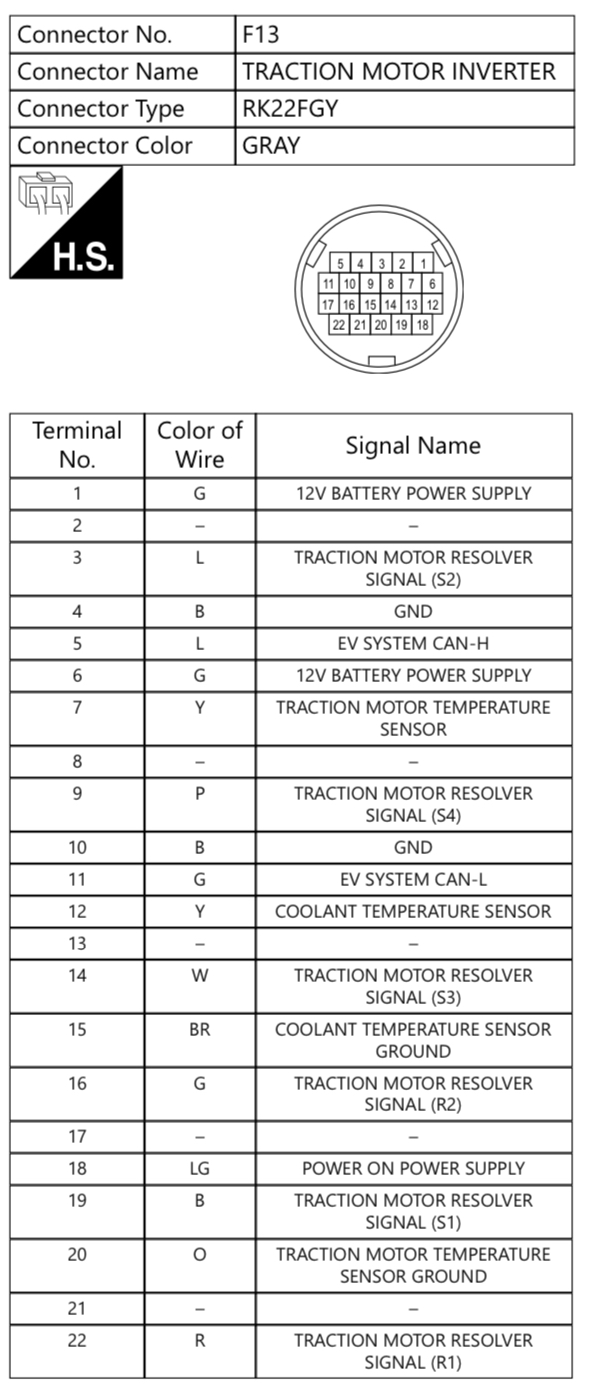 This image shows the pin-out of the Nissan leaf gen 3 inverter connector