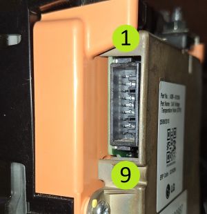 Pin 1 = +12V ('rough vehicle 12V', switched by the BMS master, not regulated) Pin 2 = CAN-L Pin 3 = CAN-H Pin 4 = Digital input (internally 50K pulled up) Pin 5 = GND (only first slave has this pin connected to the master, guess for some kind of 'first slave present' detection) Pin 6 = Digital output (open collector with 1K in series) Pin 7 = GND Pin 8 = CAN-L (parallel to pin-2) Pin 9 = CAN-H (parallel to pin-3)