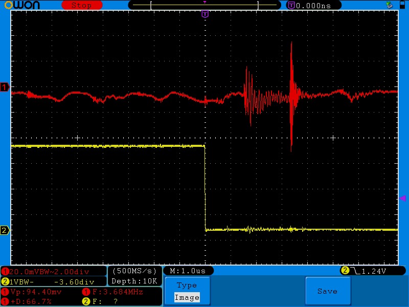 Red: current sensor signal Yellow: is ch3 PWM (for timing)
