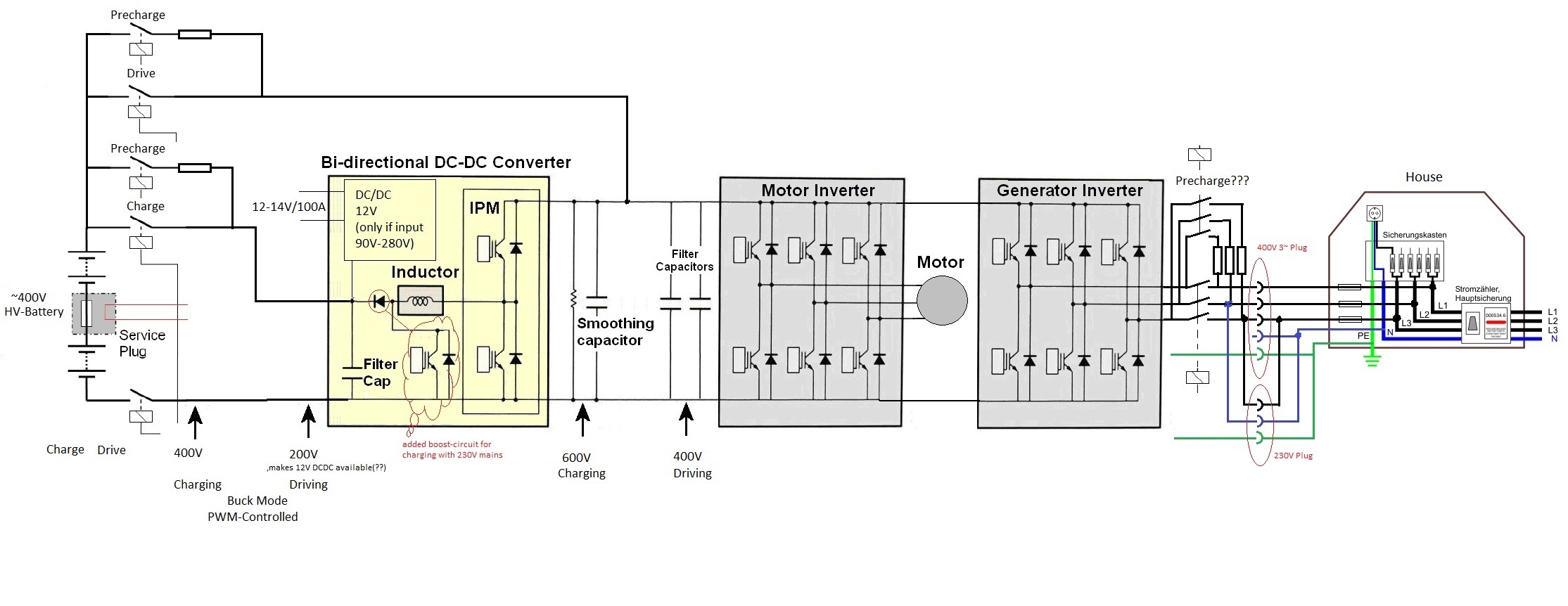 And while driving, the buck converter could produce on the "low side"-section ~250V from the 400V traction-battery ("high-side"-section) for the 14V/100A DC/DC-Converter (12V-Bat-Charger).