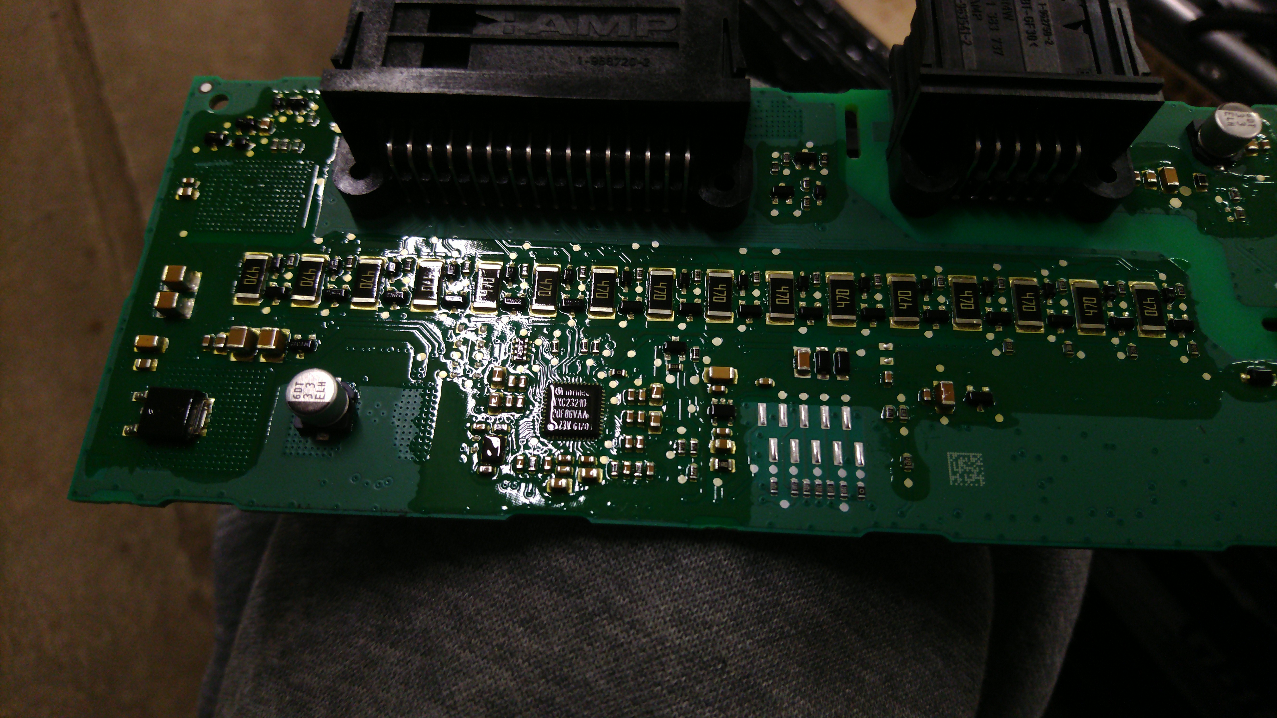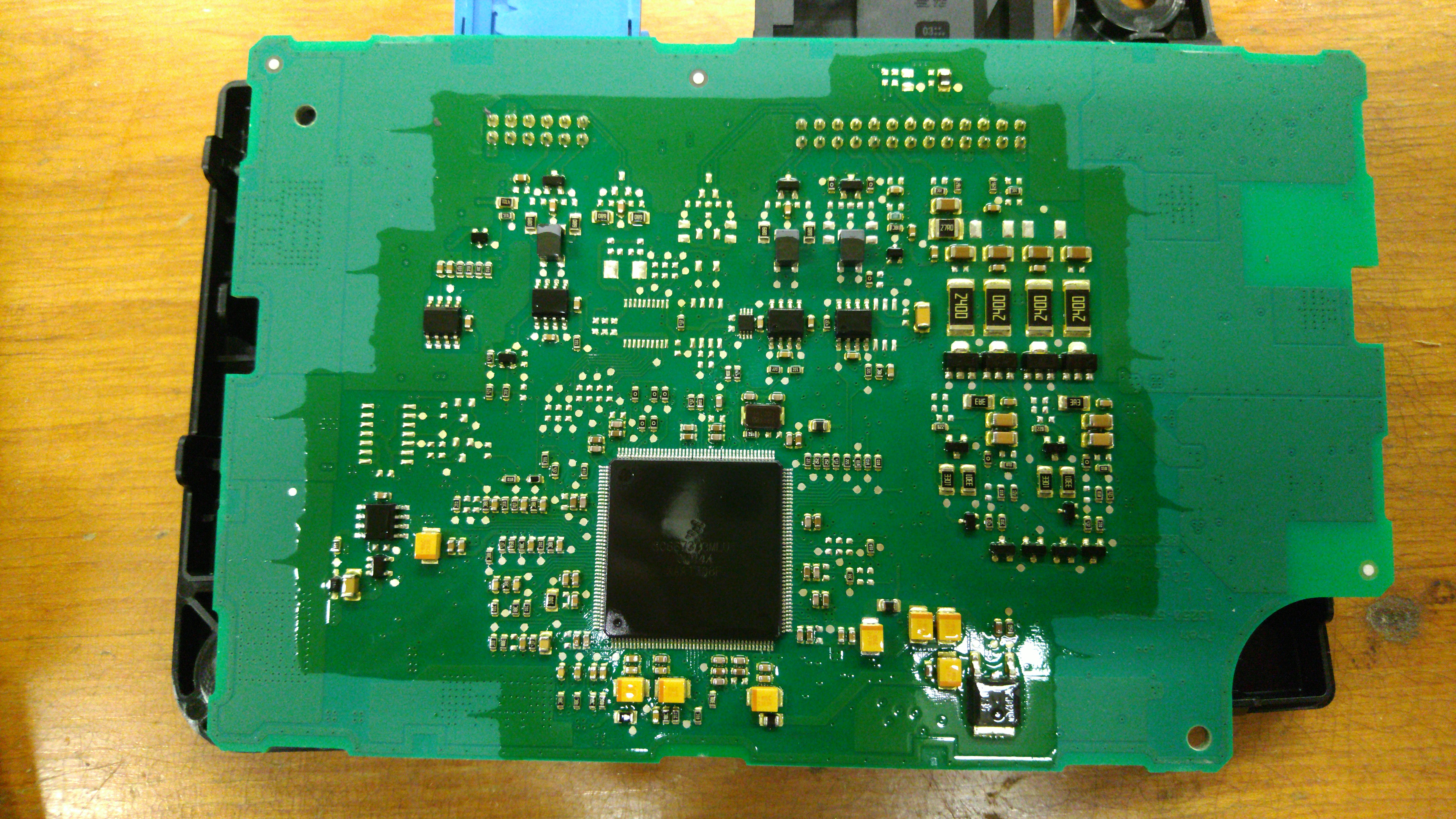 The BMS master has lots of goop and a ridiculously large Freescale chip underneath ("SC667333MLU1 OM14X XAA1708F"), and a Freescale HCS12 MCU on top with various little ICs.