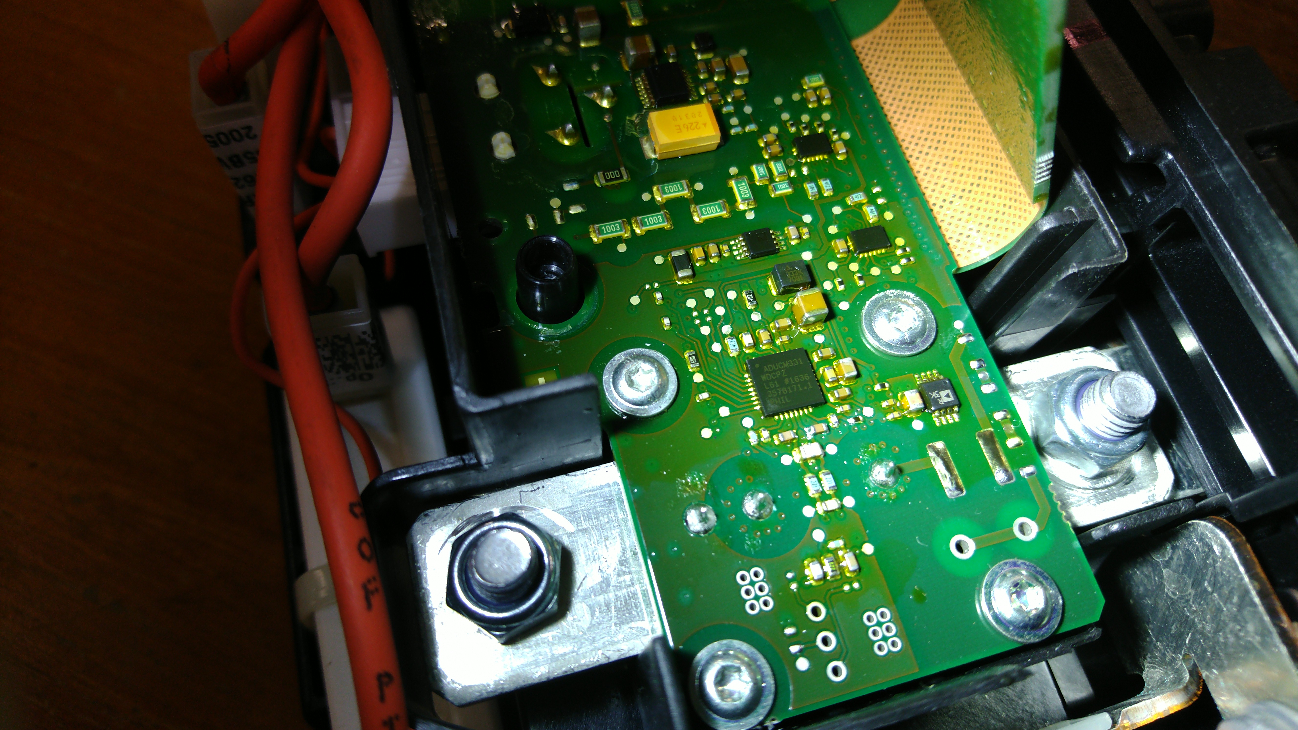 The contactor box has an ST SPC56EL60L5 MCU and an ADUCM331 as a current shunt amplifier. Some Si8441BB for isolation.