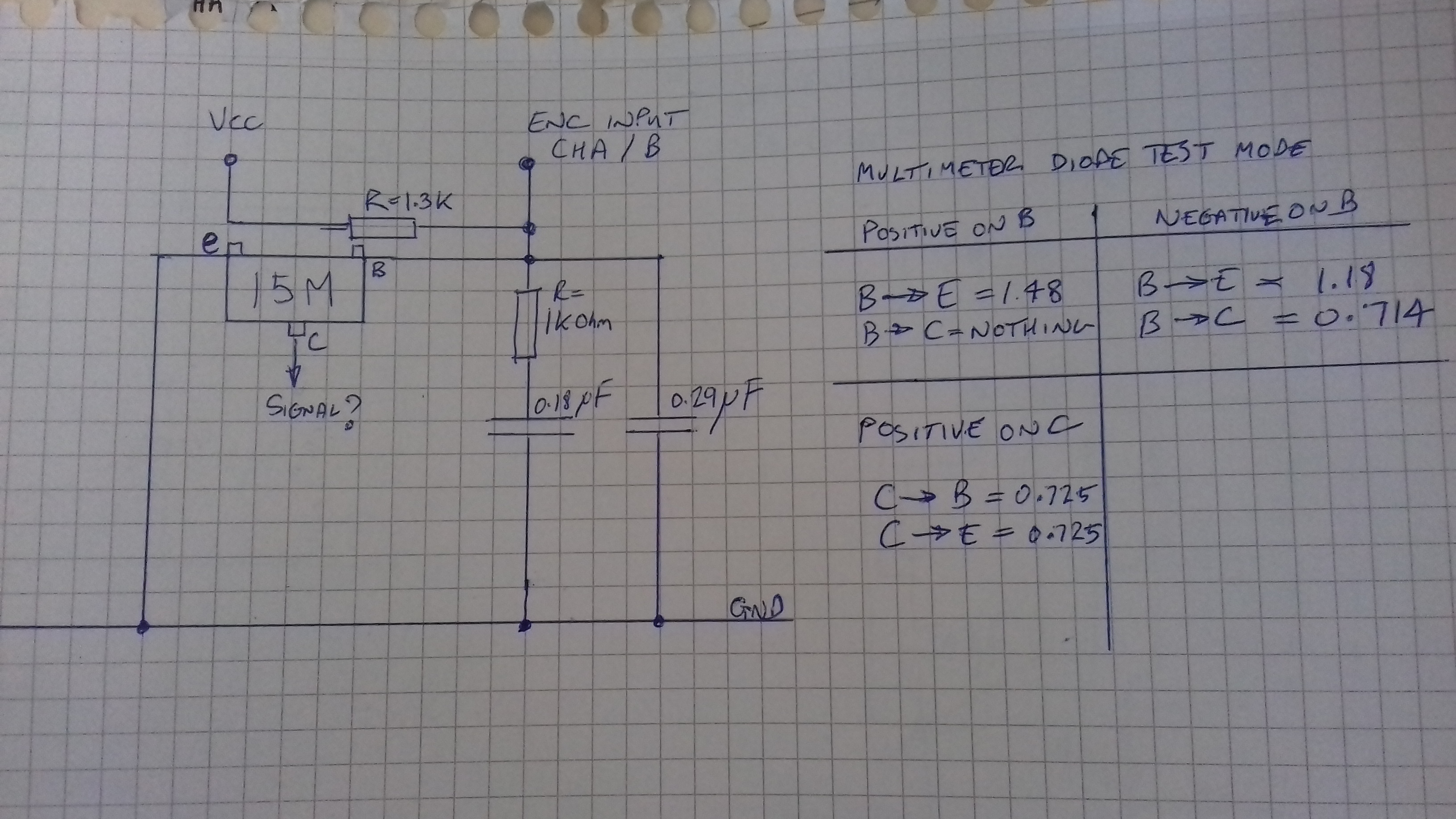 I have the 50 ppr HEDM encoder fitted, and I read it needed a quality power supply - < 100mV ripple I think it was, also it has limited signal current output - 5mA, so im thinking I check the resistance to the base of the transistor, maybe it is too low? I do have different resistor values on my early board as I notice these changed at some point. Perhaps remove R1? Hope to get some time today to take a look, I let you know how I get on.