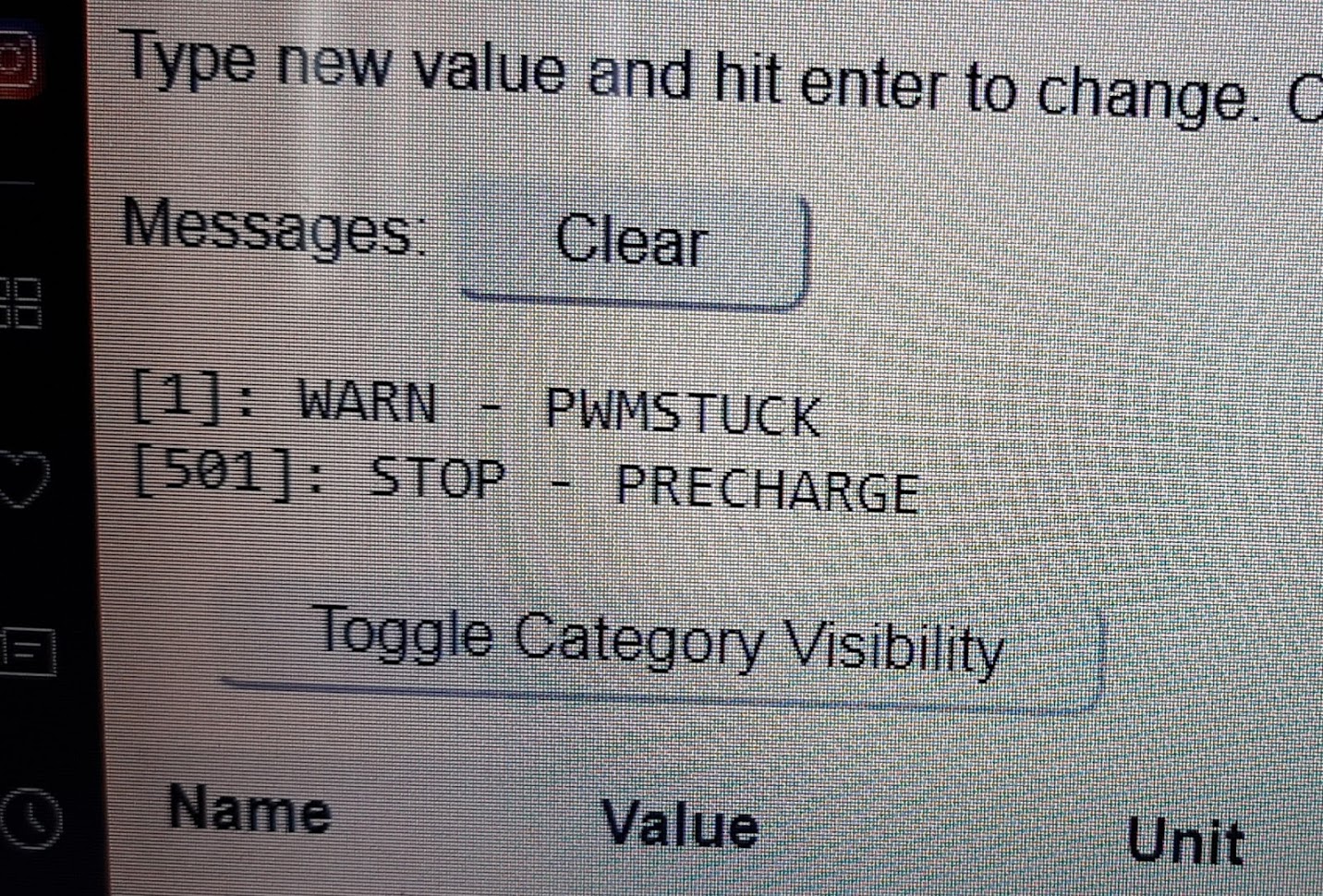 I've tested it on circuit emulator After an hour of soldering misery this thing was born: And if nothing is attached to its inverting input, and little dc-dc stepdown board provides 5.5V, this is what we see at output: And the board is happy. Now after I've set all the parameters, but the board is not connected to anything yet, it is not happy about precharge. Are errors marked as [WARN] don't stop the inverter from operating?