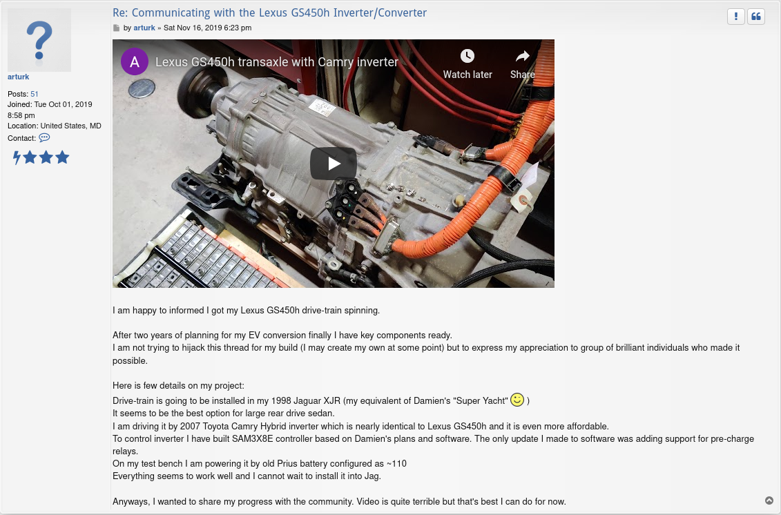 Very interesting that the inverter board is shared with the GS450h!Thatguyoverthere wrote: ↑Sat Jun 20, 2020 1:45 am Forgot to mention the inverter boards are identical between the Camry Gen 1 and the GS450h, as evident by their part number. I knew this already because someone here was using this inverter for their GS450h transmission.