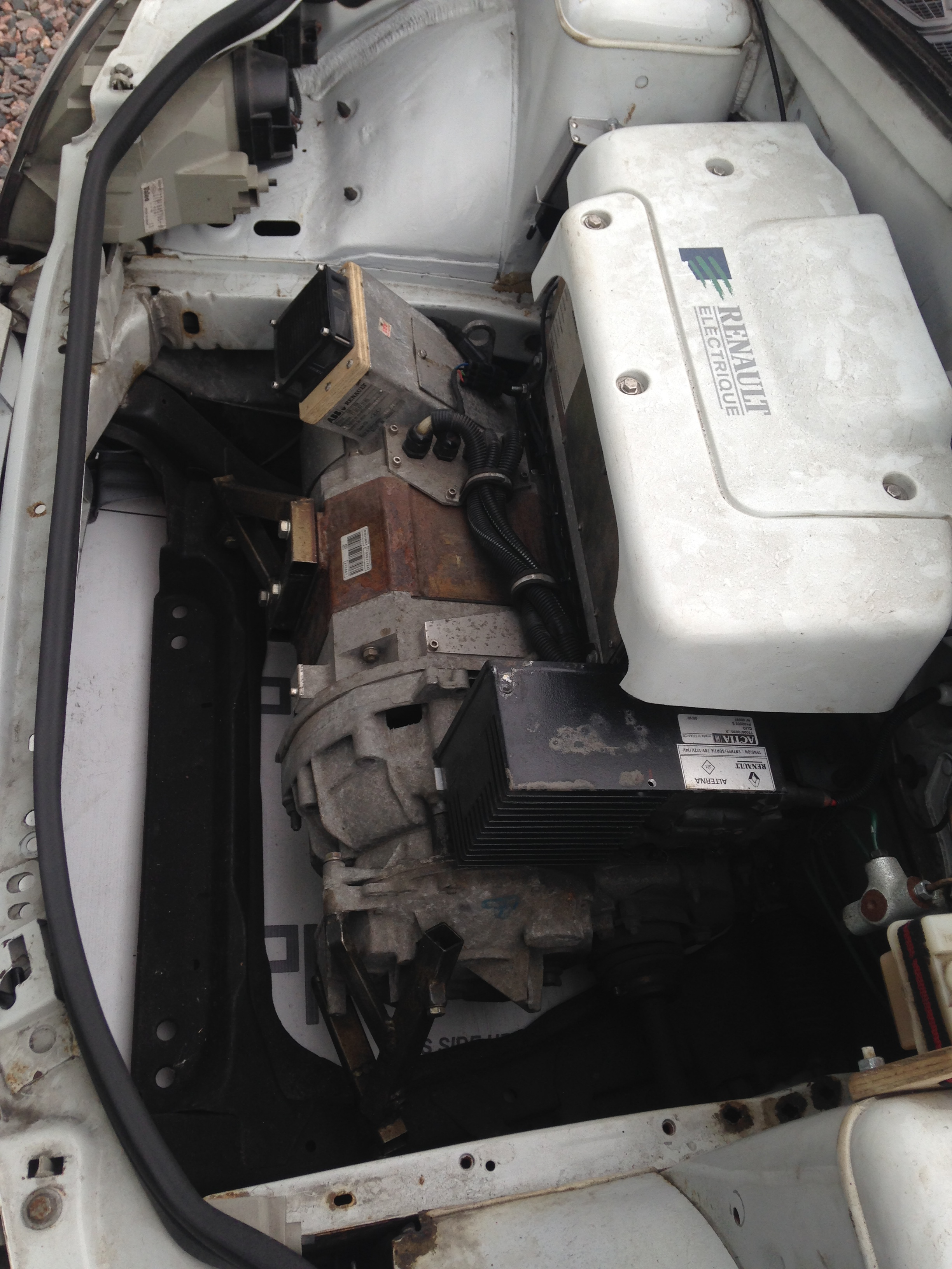 It started out as a stock Renault Clio Electrique from 1997. I bought the car in working condition but without the original NiCd batteries. First thing I did was to build a battery pack from used Headway 40152 LiFePO4 cells and fit them in the car. Ended up with a 42S5P pack with nominally 134V and 70Ah.
