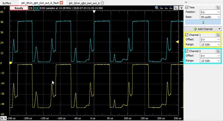 This is the faulty IGBT output, when i give moore throttle: (2-3kRPM, 2-3Amp)