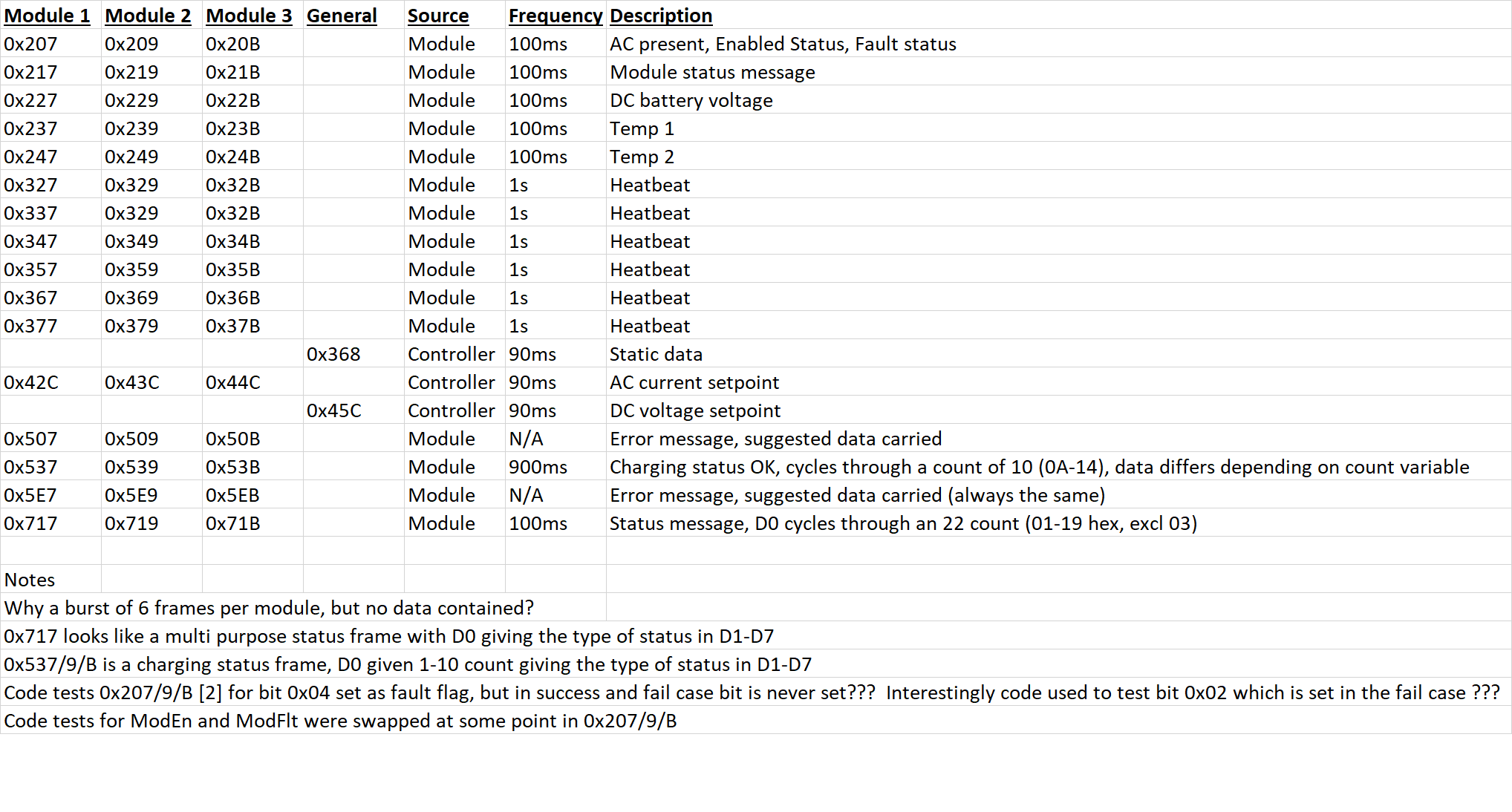 I'm digging through the data to see if I can find anything that occurs or is concurrent with the charger failure to start charging with 2 modules enabled. There are some codes 0x507/9/B and 0x5E7/9/B that appear to occur when the charger is failing or resetting. Both frame sets look to be carrying data. The 0x5E? set reports the same data for all modules and the same data in every report. The 0x50? data also carries data, and the values there do change from report to report.