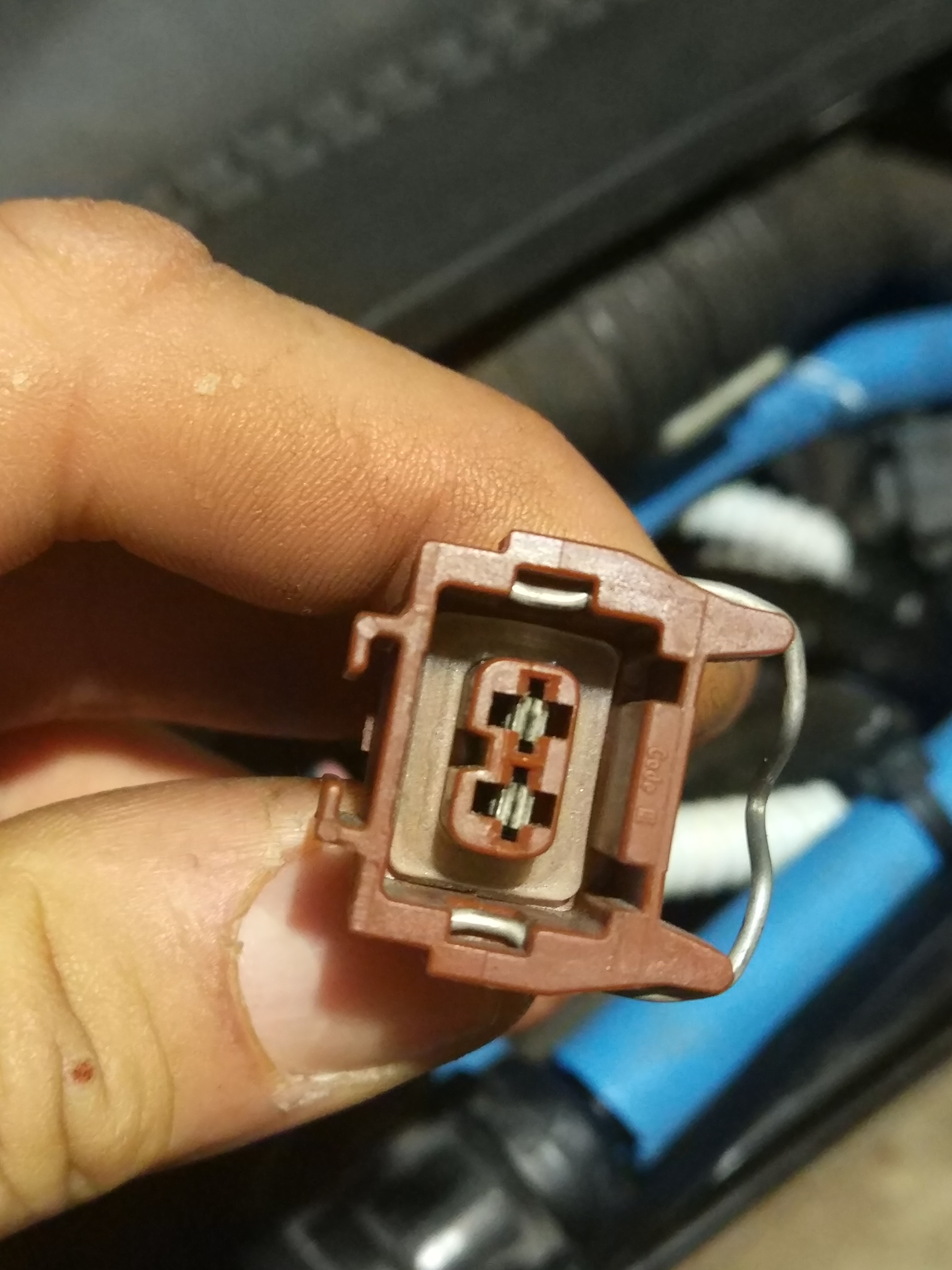 Connector is Bosch of some variant... One line goes to GND and the other one connects to the relay which is powered by fused 12V on the other side.