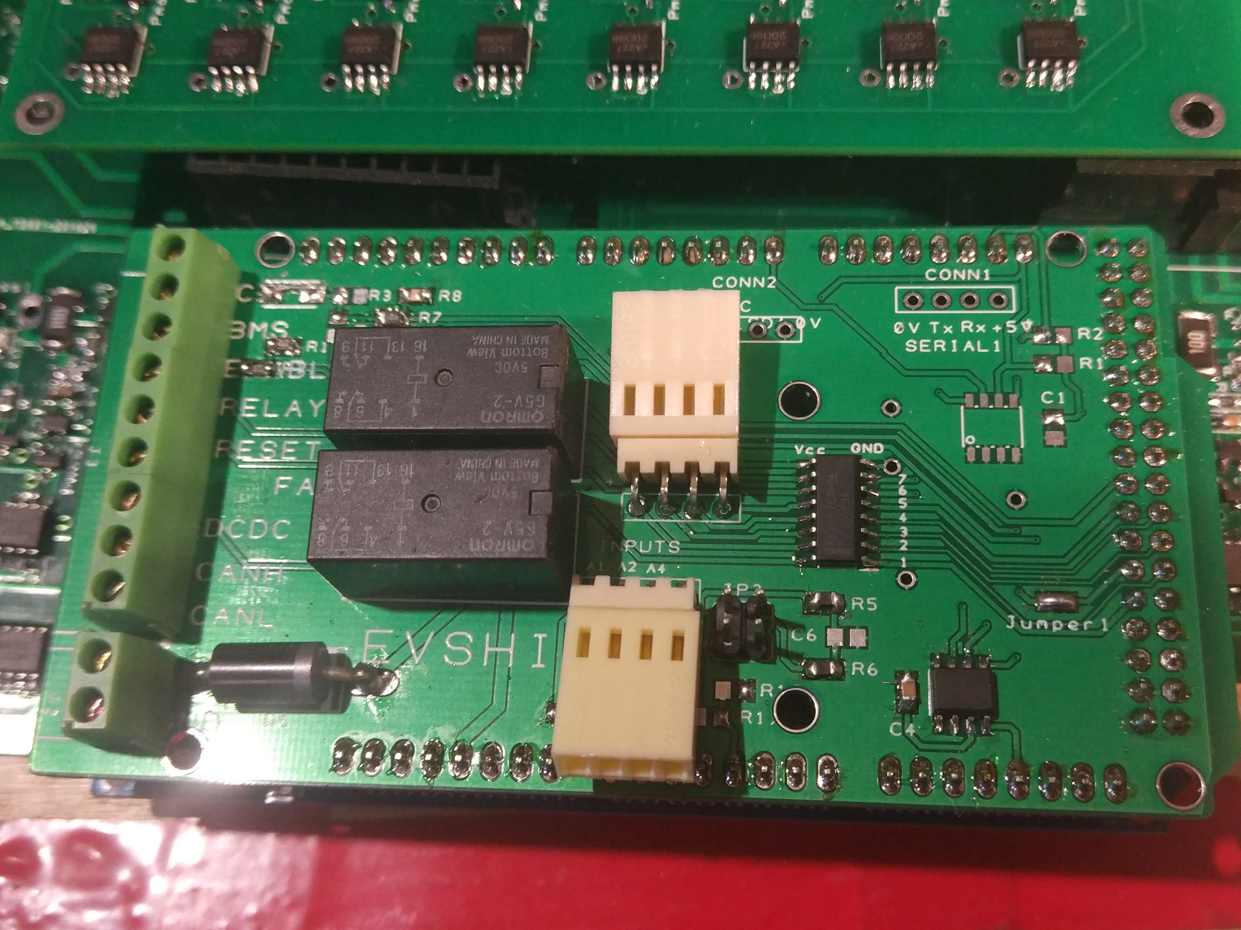 One board is capable of guarding 16S setup with no minimum requirements. I.e. a single cell could be watched by one board or up to 16 cell string. 4 wires are connected to BMS board and 4 wires go from one board to next BMS board or finally to master board. Both OV and UV signals are AND loop where a single deviation causes disconnect of appropriate function. For example if in the course of a charge single cell would hit OV alarm, then charger would stop. UV signal is wired directly and it is used to stop the car in case of undervoltage.