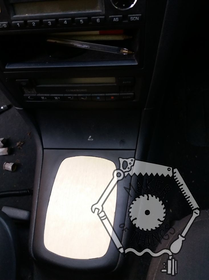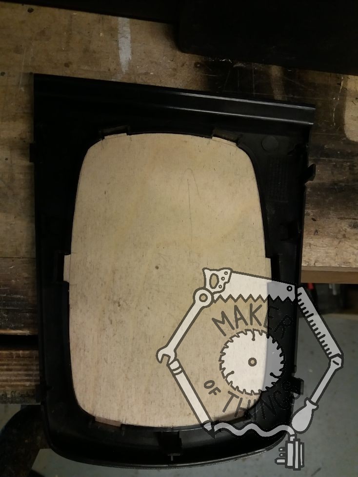 I then removed the plastic trim from the gearstick boot and used it to make a 6mm birch plywood infill piece. I included the tabs in cutting out the plywood so that it would clip in place and be flush to the surface.