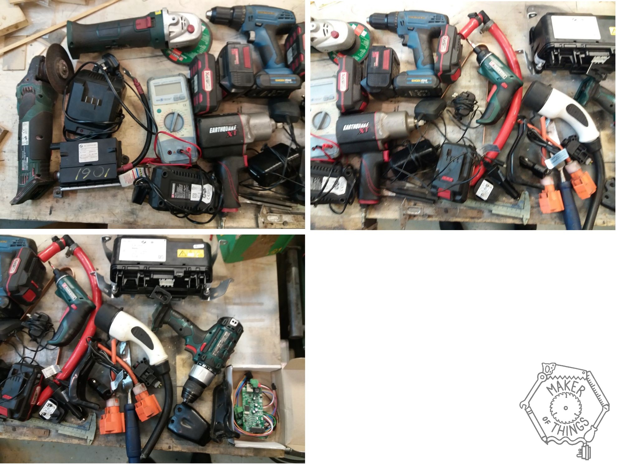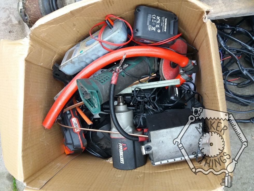 I have had a play with the random stuff too. I should be able to put them to use. The tool batteries seem ok, but the chargers don't seem to recognise them for charging. If I can't repair them I can make battery converters to run them from Bosch or DeWalt batteries as needed. I have just gone from a 6 x 115mm angle grinder house to an 8 x 115mm angle grinder house! :D