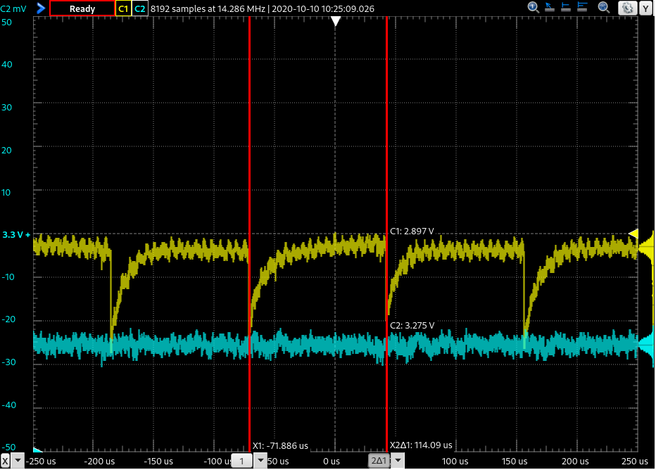 If so, it would further strengthen that something in control loop is drawing current and not the ADC sampling as the disturbance seen on ADC inputs are at 114us appart.