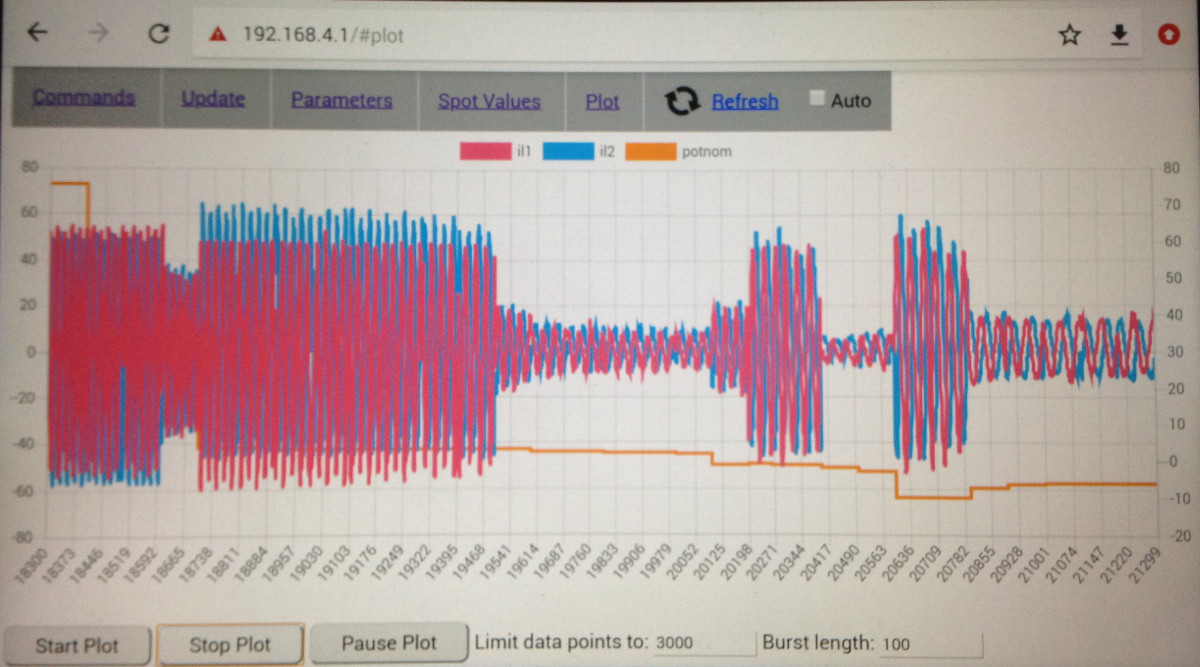 Here is one plot during acceleration. On the left axis is IL1 (red), IL2(cyan), POTNOM(blue) and on the right is motor speed (yellow). Divide motor speed by 65,8 and you get car speed in km/h.