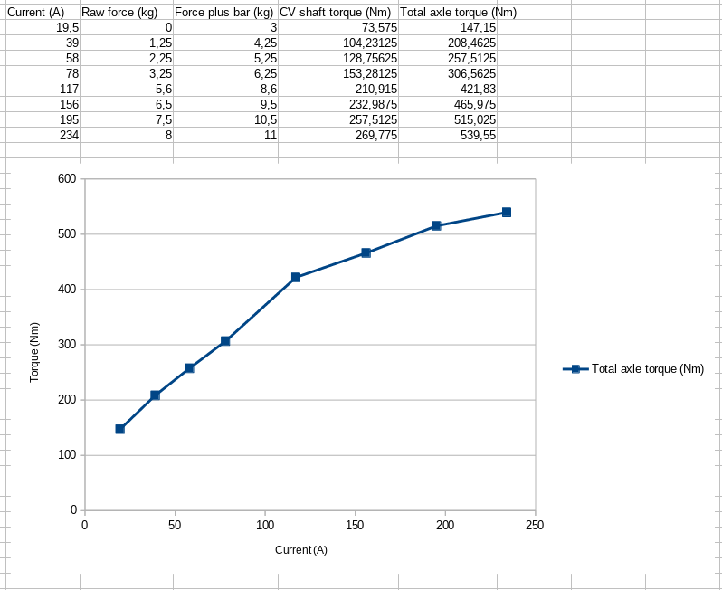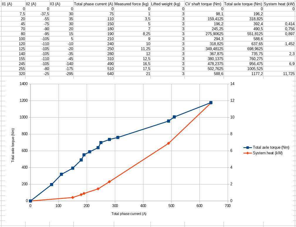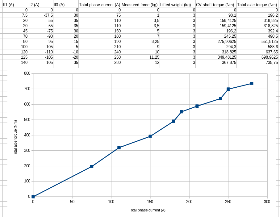 Anyway, this is what I got so far. The current is simply throtcur*potnom. I haven't checked whether the inverter is reading correct current values compared to a clamp meter so you should assume it's probably wrong. On the other hand, I'm assuming the force measurements and calculated torques are somewhat accurate. Probably a good idea for me to check Iq and Id also, the inverter shouldn't be using much Id in this case.