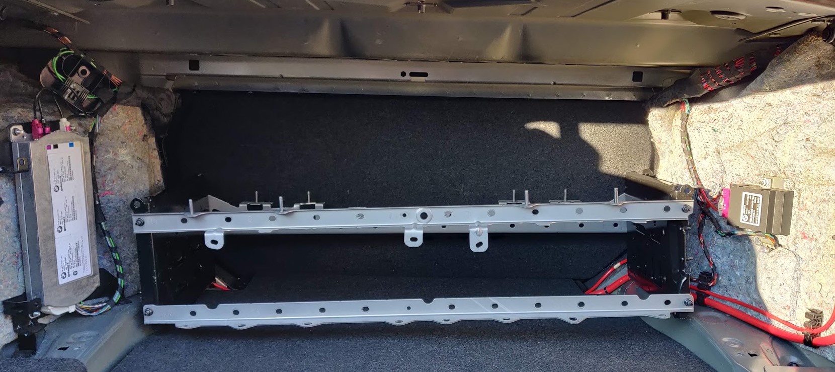 The 12 module rack from the leaf fits nicely within the boot. The seats don’t fold so nothing lost there. Should only loose 400mm depth from the boot. Need to decide is this needs to be in a box or to just fit some sort of plate to protect the batteries and cover over with boot lining material.