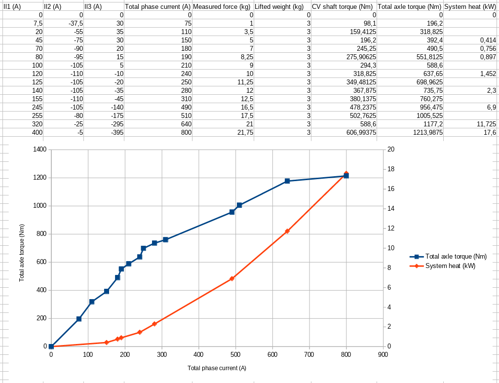 When adding this final data point it looks like the torque curve flattens at 1200Nm and feeding more than 700A of phase current will only make more heat.