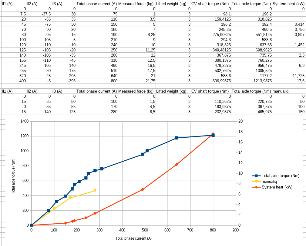 Well, anyway, it wasn't comfortable at all to use manual mode - I also had issues with precharge and contactor control. Using normal mode on the other hand did feel fairly safe and I could do a set of measurements with re-flashed firmware if someone has better MTPA parameters for this particular motor.