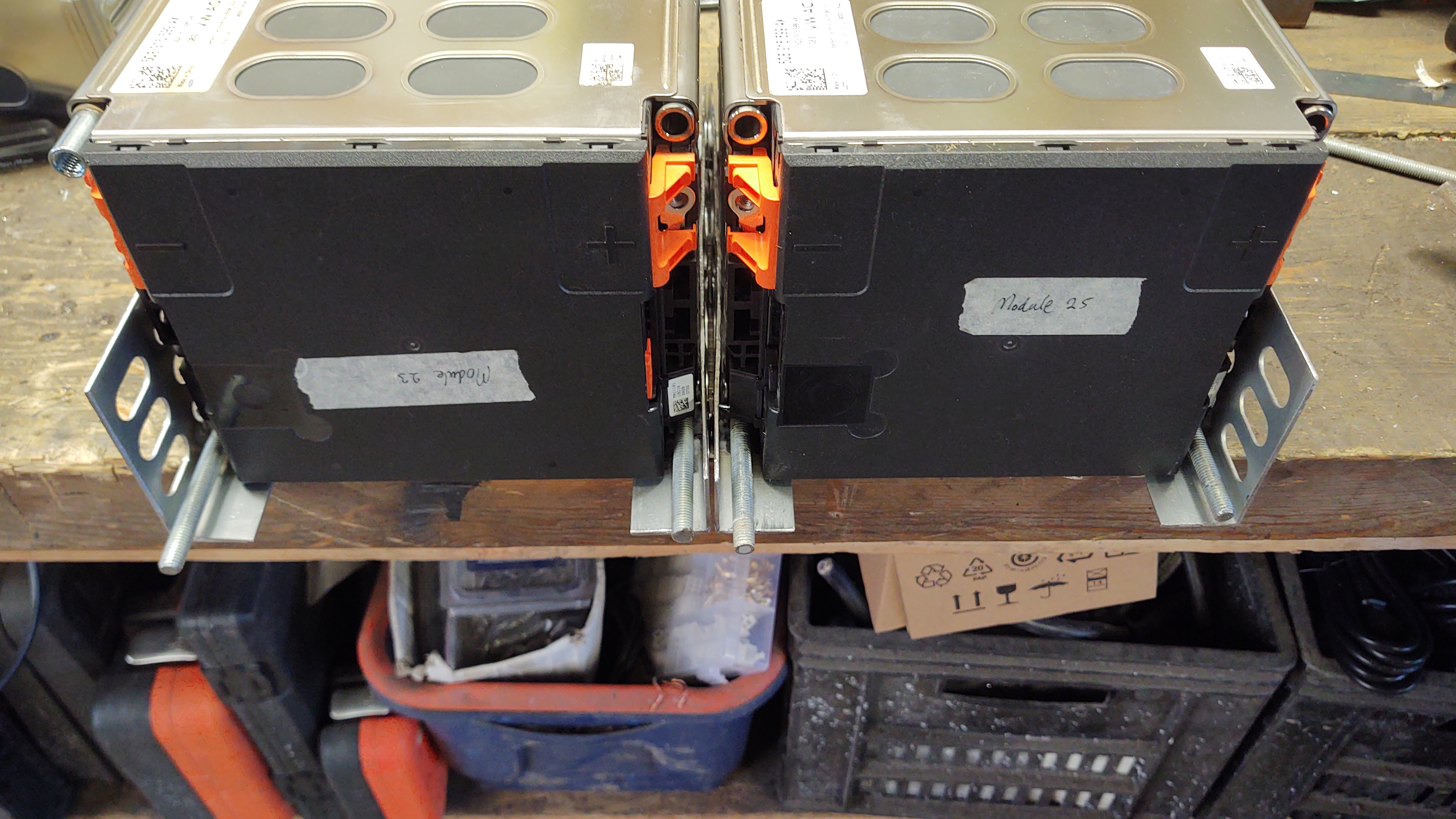 This is the four brackets made and they are a tight fit. I'm waiting for some threaded stud connectors to screw onto the ends of the threaded bar as I've no access to tighten nuts. Originally I planned to weld the inner brackets together but I think it will be easier to manage two modules at a time rather than 4.