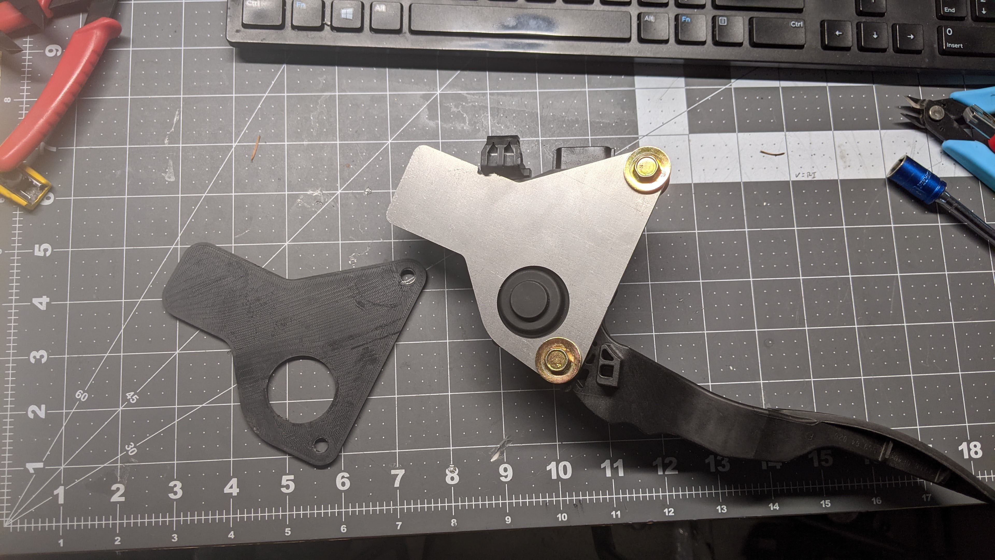 Leaf pedal proto and final bracket. GOT to design > proto > test > design > proto > make