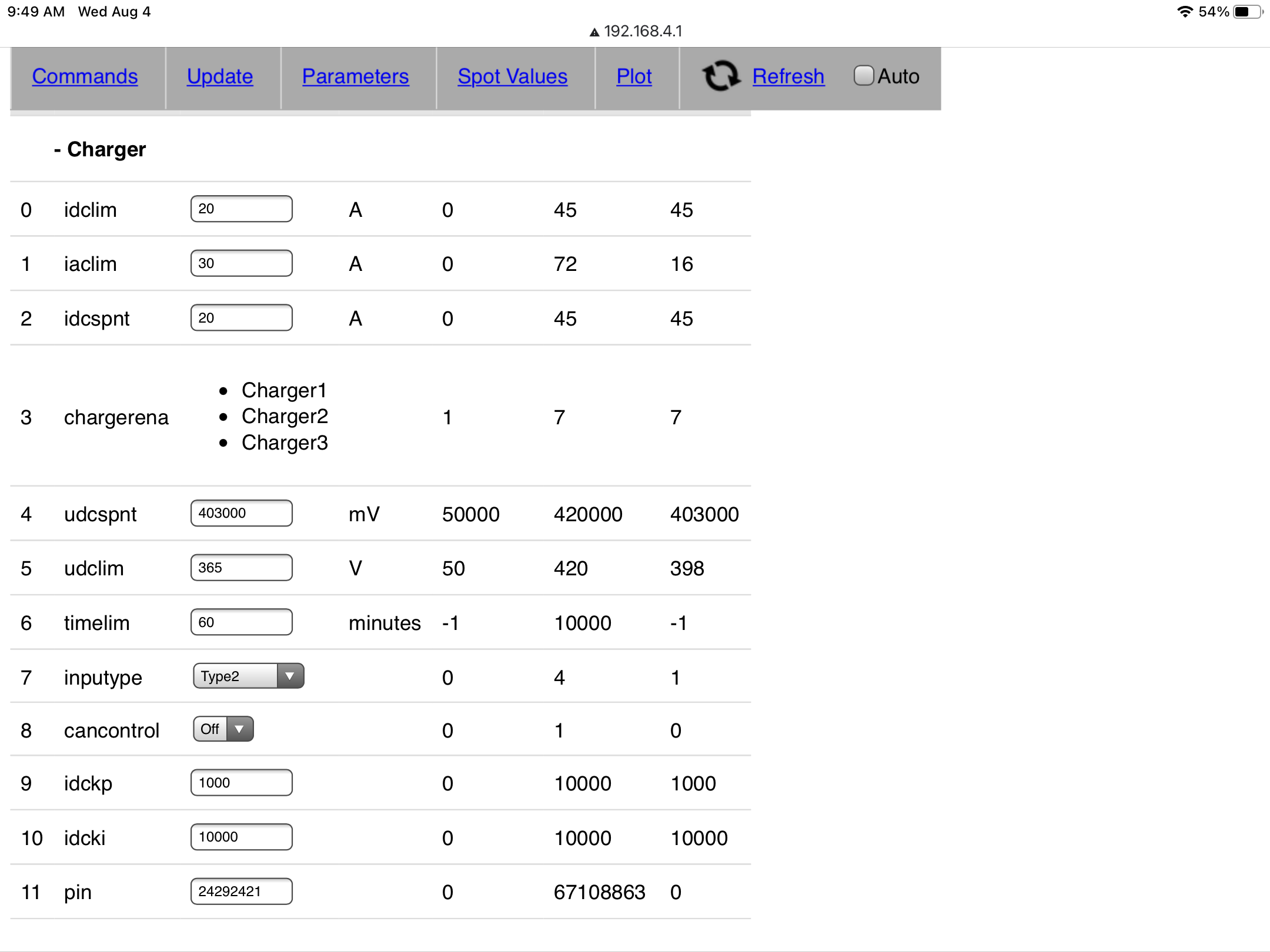 The only one which responds somewhat properly but not quite. When I set udcspnt and udclim slightly above current battery voltage (172V) and trigger charge then it looks like it wants to charge but quits immediately. I think this is because power module reports battery voltage as 232V !!! When I set charging limit to 240V then it seems like it initiates charging but current going into battery is only ~0.2A