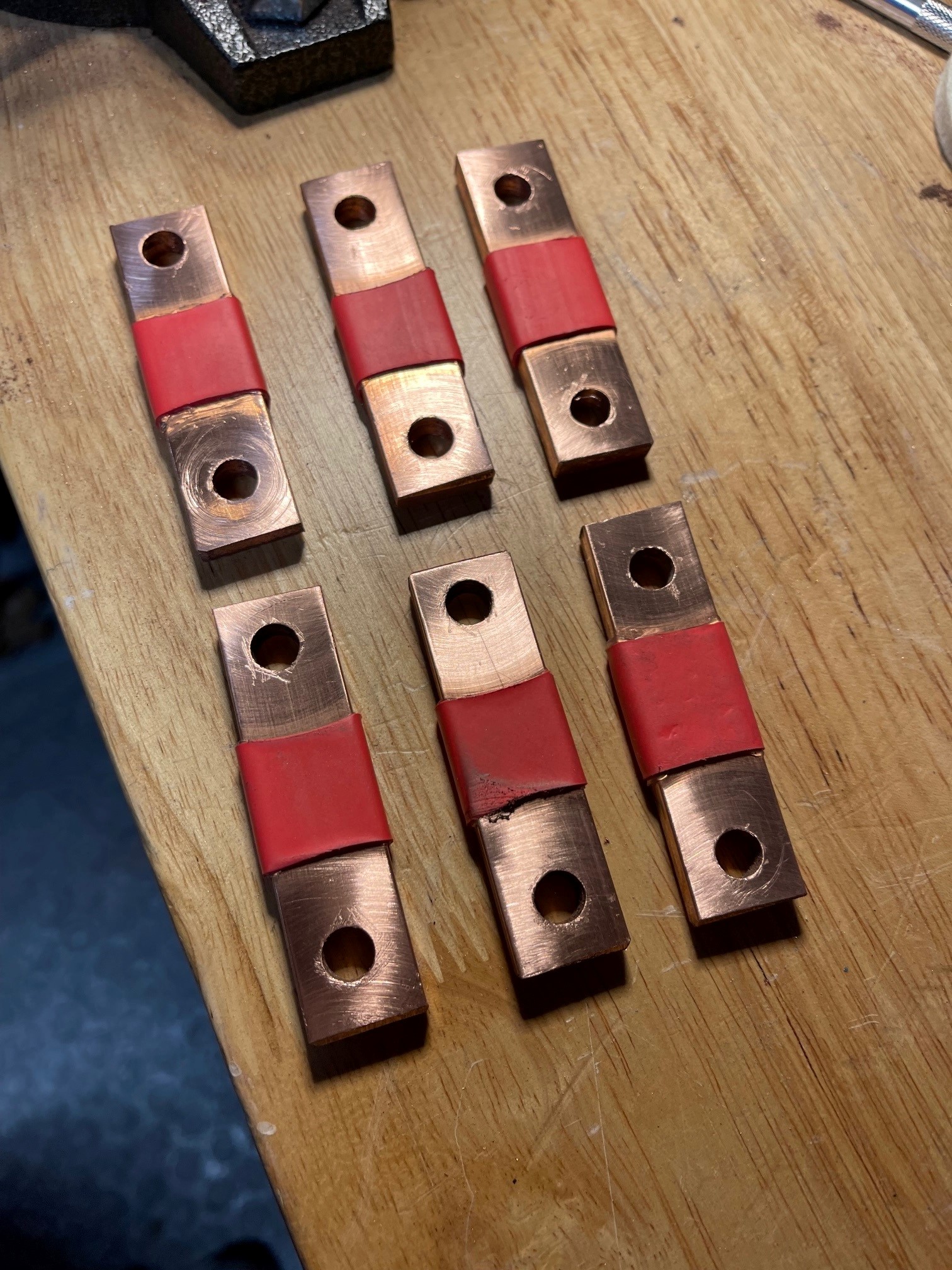 Made 6x busbars to link up the 1st battery pack (don't actually need 6 for one pack, but needed extra for the second pack later). On top of that I made a prototype HV component box setup using some wood as a base for now. I'm only focusing on 1 battery pack for now and will worry about the second one a bit later.